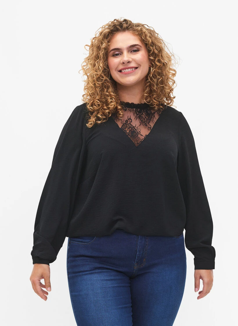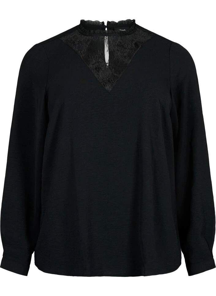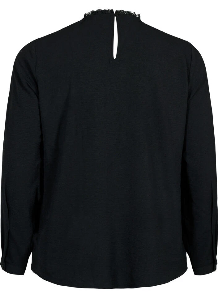 Beautiful blouse with feminine lace details at the neckline and a keyhole closure at the back, as well as long sleeves with button fastening. The blouse is made from a soft material with recycled polyester and has a regular fit.