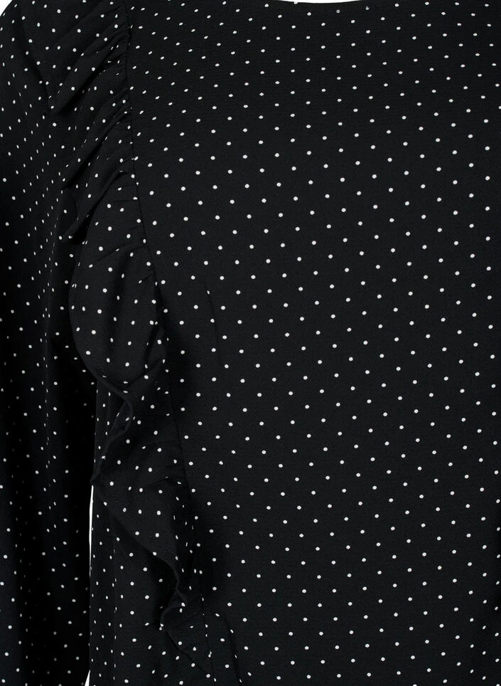 Long-sleeved blouse with a round neckline, made from a quality fabric containing 55% recycled polyester, which drapes lightly on the body. The blouse features feminine ruffles on the front, providing a feminine look.