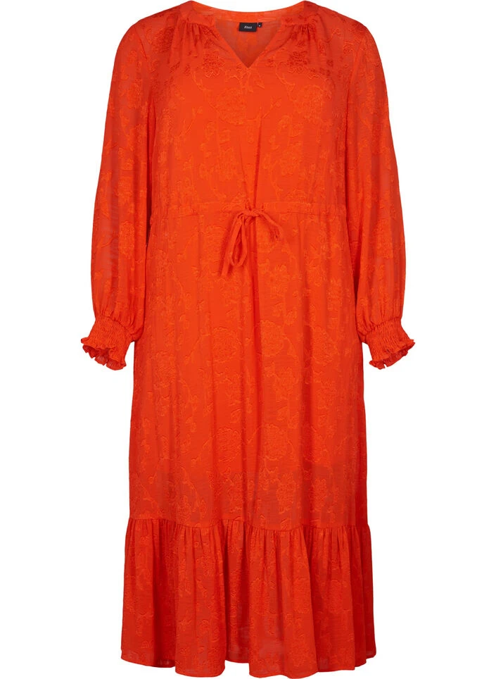 Beautiful midi length dress made in a light and comfortable quality with a jacquard look. The dress comes with a matching petticoat and has long sleeves with smock, a pleated hemline and adjustable ties at the waist for a feminine silhouette.