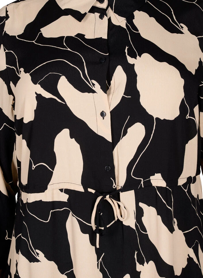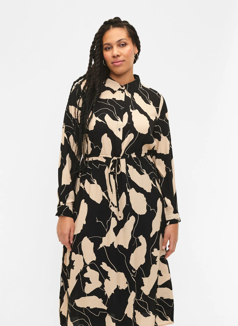 Midi dress with a beautiful all-over print and a tie waist for a feminine silhouette. The dress is made from a lovely viscose fabric with 51% LENZING™ ECOVERO™ Viscose and it has a classic shirt collar, short button fastening and long sleeves.