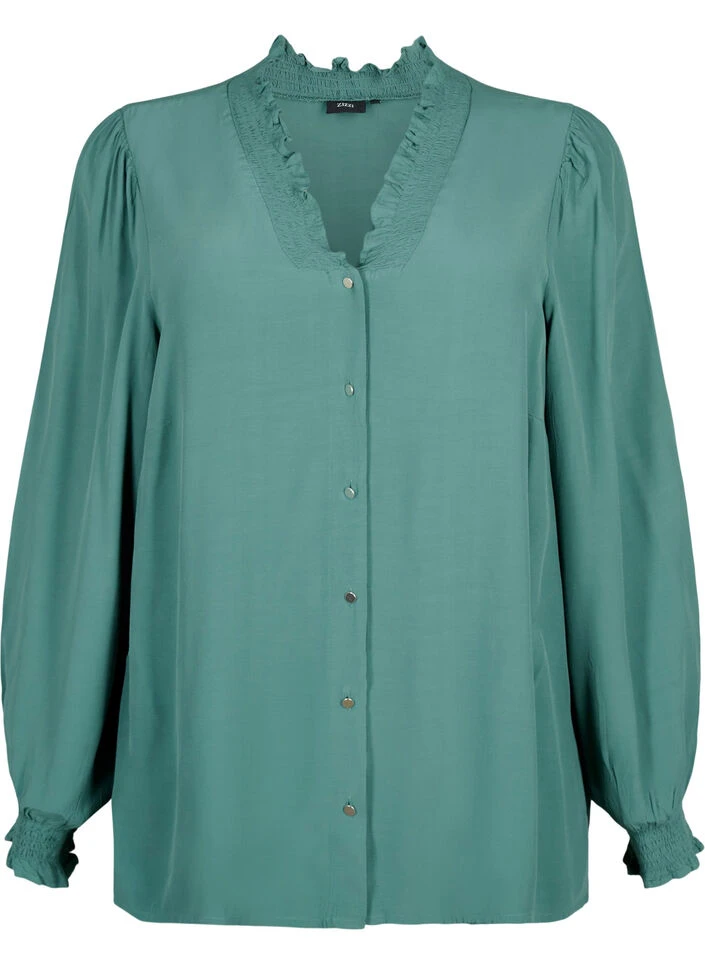 Shirt blouse in a soft viscose quality with 51% LENZING™ ECOVERO™ viscose that closes with buttons at the front. The shirt blouse has a V-neckline with smocked hem, and long sleeves with smock at the bottom and pleats on the shoulders that gives a nice effect to the sleeve.