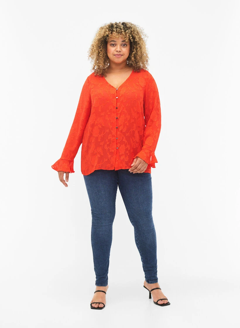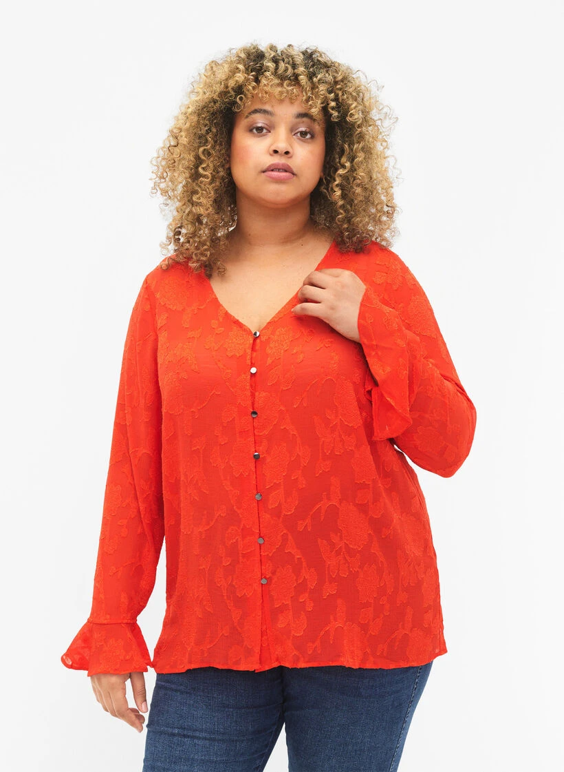 Beautiful v-neck shirt in a slightly transparent quality with a jacquard look without lining. The shirt has long sleeves with a cutline at the bottom, which creates a nice trumpet sleeve and adds a feminine and stylish detail to the shirt.