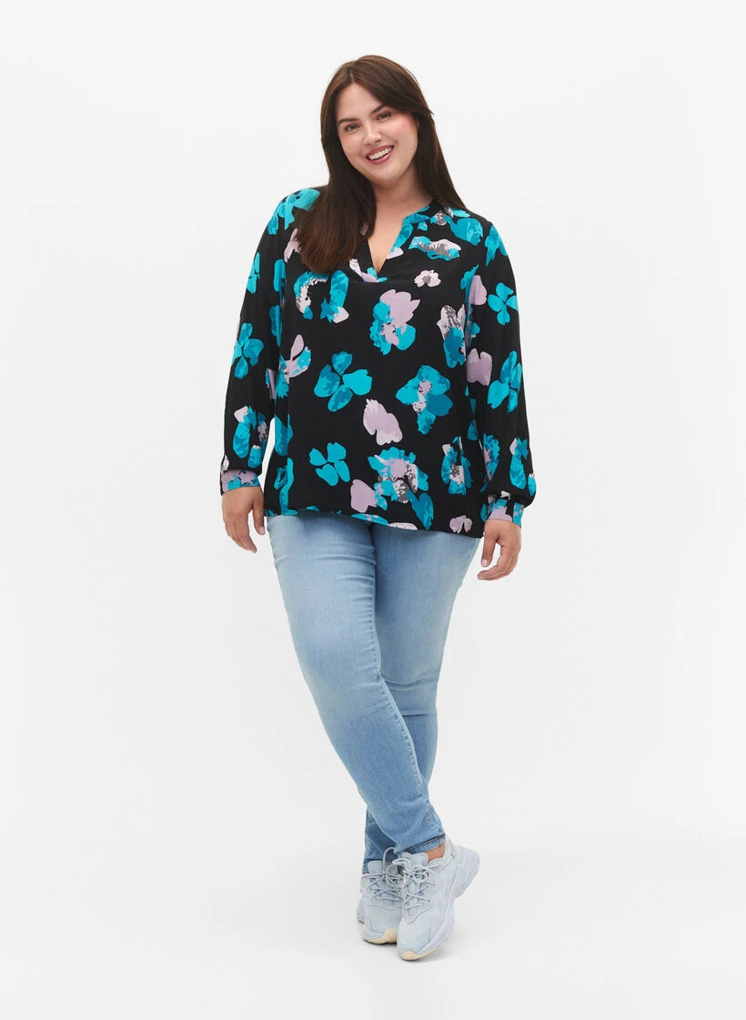 Blouse with a beautiful all-over print, made in viscose quality with 51% LENZING™ ECOVERO™ Viscose. The blouse has long sleeves with cuffs and a round neck with a v-neckline.
