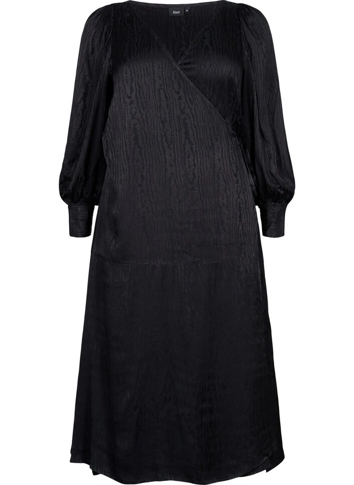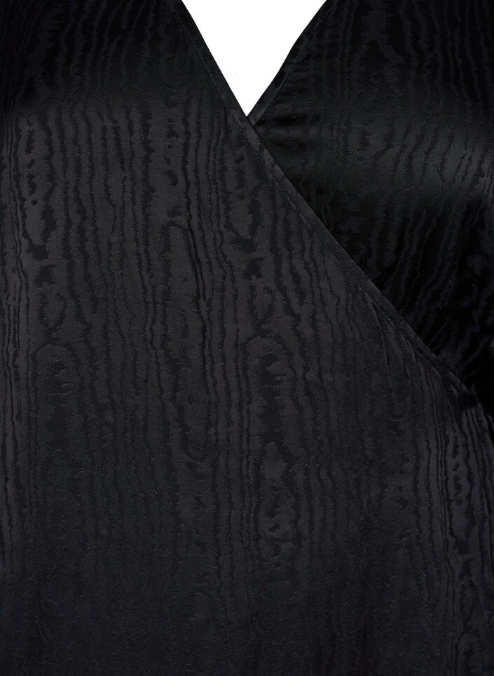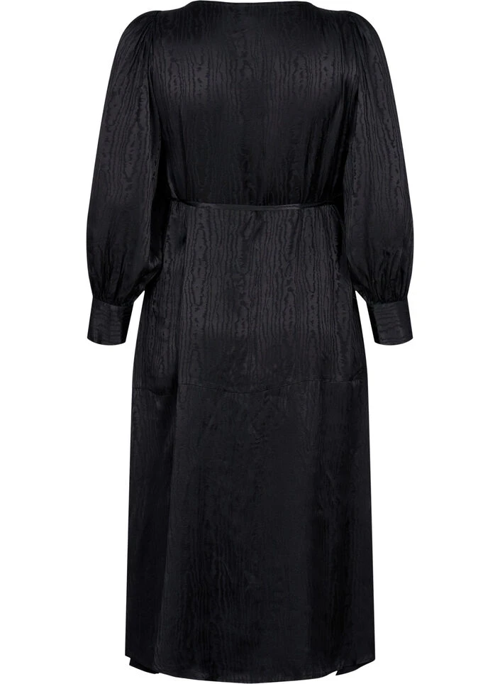 Midi dress in 100% viscose with a beautiful tone-on-tone pattern. The dress has long sleeves with wide cuffs and a V-neckline with a wrap design and ties at the side.