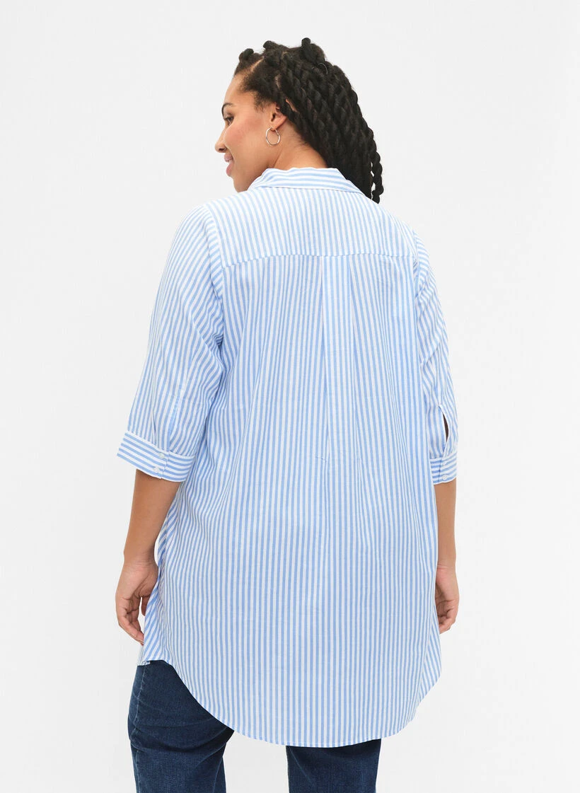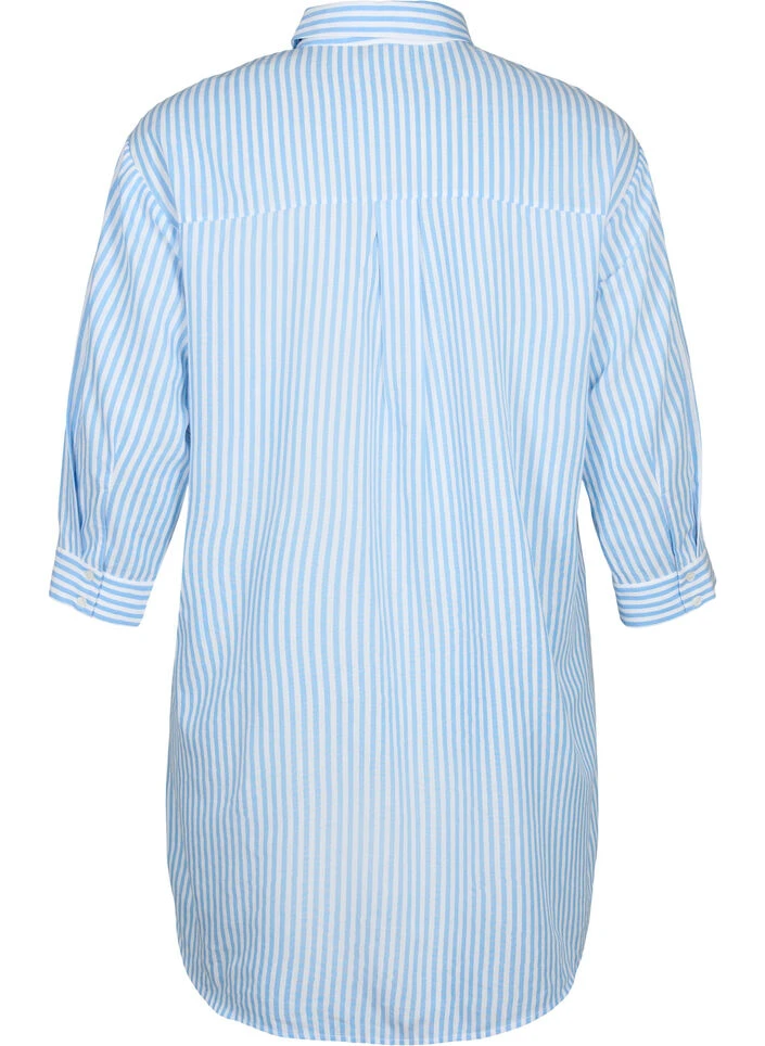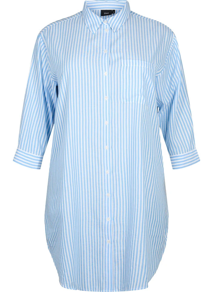 Long shirt in a comfortable cotton, and viscose blend with a striped design. The shirt has 3/4 sleeves with cuffs, classic collar and button closure, chest pocket and rounded hem.