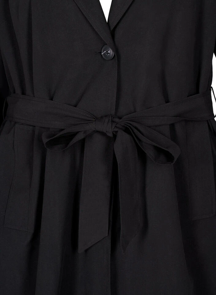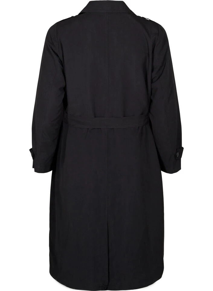 Timeless long trench coat with matching belt and side pockets. The coat is made from 100% recycled polyester and designed with decorative shoulder straps, long sleeves with adjustable straps and a split at the back.