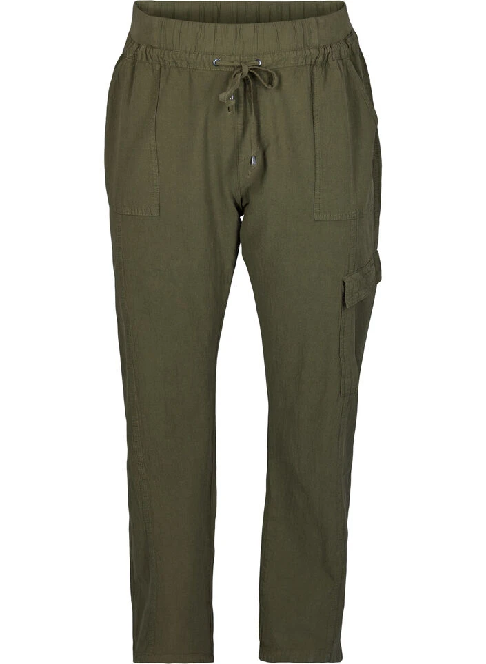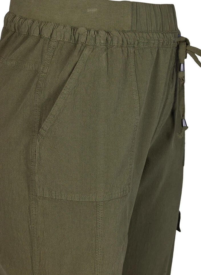 Super comfortable cargo trousers in a simple design, which is made of 100% cotton. The trousers have a loose fit with large pockets and elastic ribbing and adjustable drawstring waist.