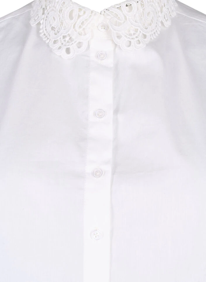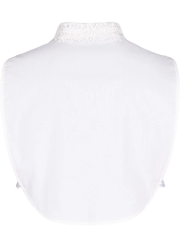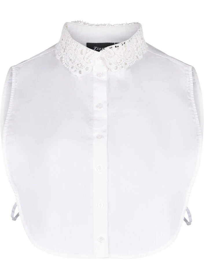 Loose, solid colour shirt collar in 100% cotton. The collar is designed with feminine lace, and fastens with buttons on the front. Can be styled under knitwear or a blouse for a trendy look.