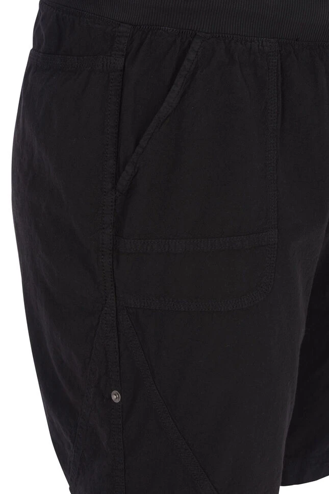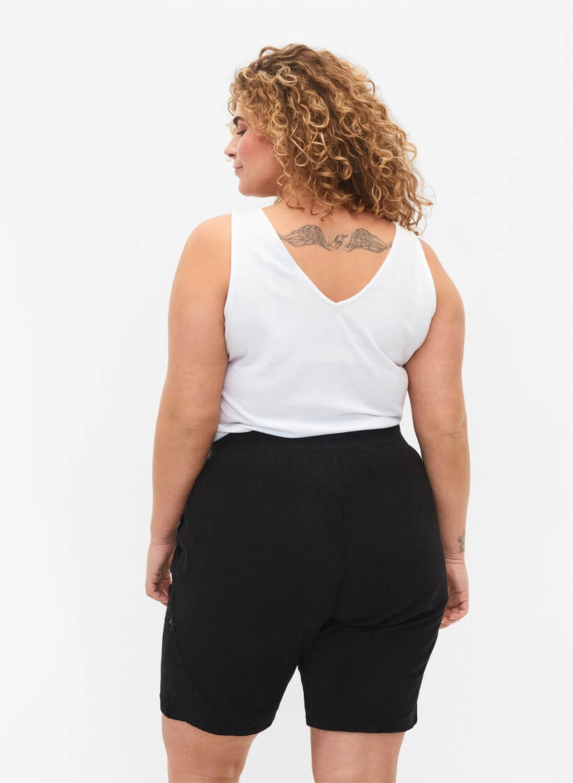 Loose plain shorts, which are made of 100% cotton. They have a comfortable elasticated waist with adjustable drawstring and pockets at the sides.