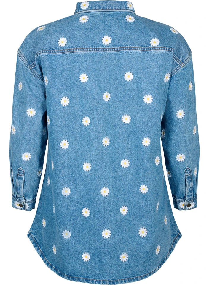 Loose denim shirt in 100% cotton with fine embroidered daisies. The shirt has a snap button closure, snap button cuffs on the sleeve and a rounded hem.