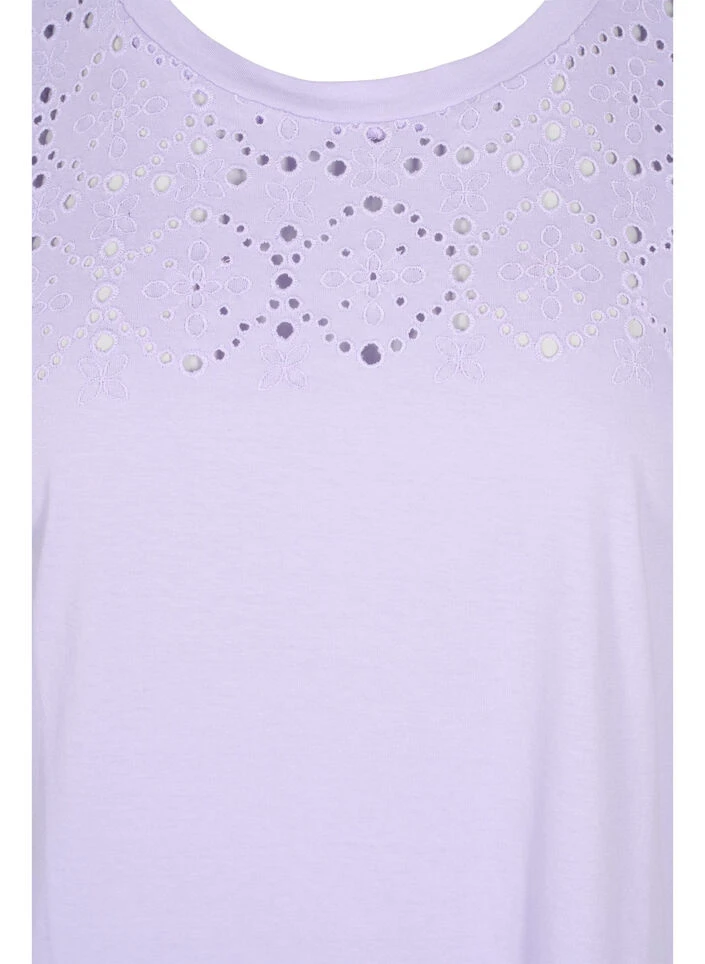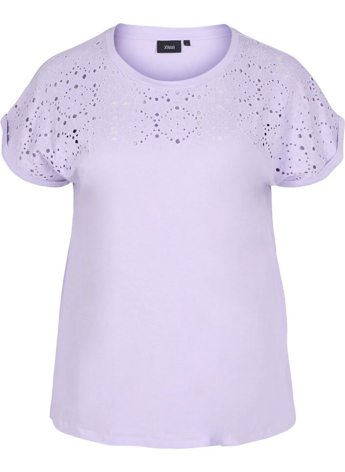 Nice t-shirt in a comfortable cotton quality with loose fit. The t-shirt has short sleeves with turn-up, round neck and a super feminine broderie anglaise on the front.