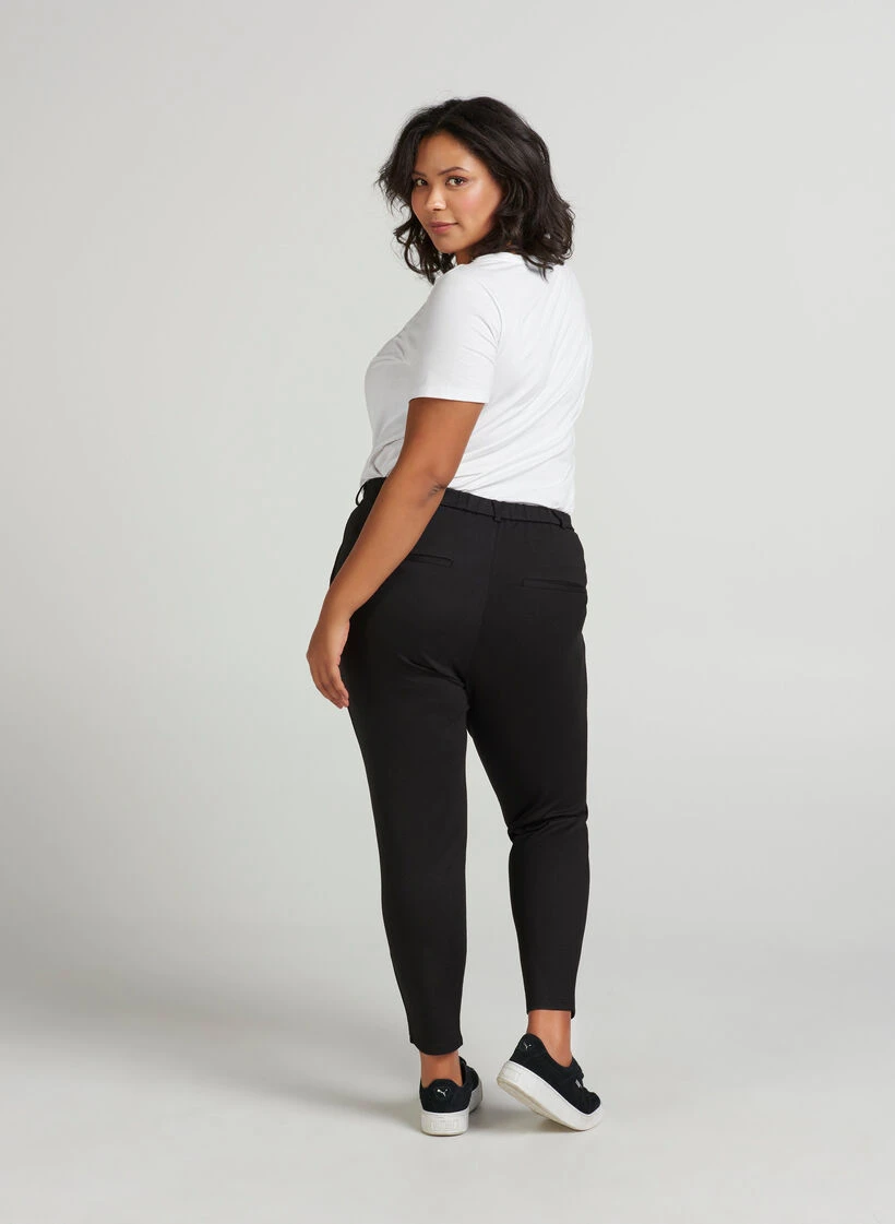 These trousers are a combination of suit trousers and jogging bottoms. They have the elegant and stylish details of suit trousers, such as belt loops, pockets and the cut. The fabric, though, is more like that of jogging bottoms, and the trousers are thus suitable for both daytime and evening/party wear.