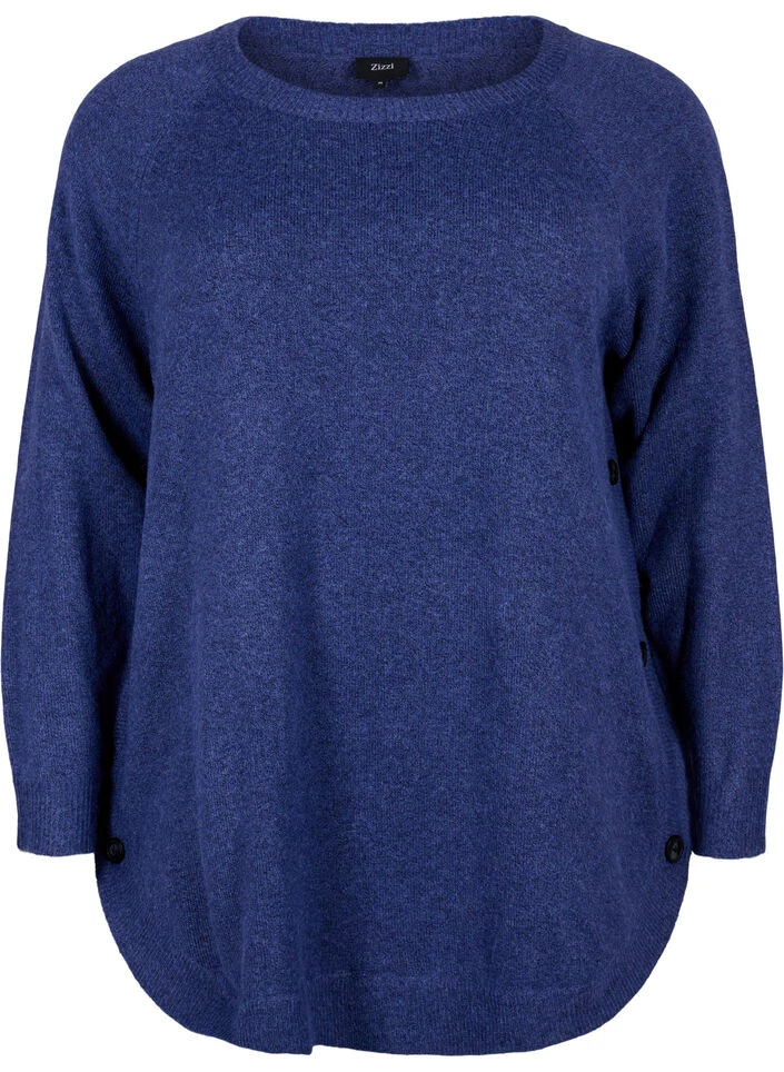Beautiful and simple knit blouse with a round neckline, made of 94% recycled polyester. The knit blouse features fine ribbed edges, decorative button details on the sides, and a loose fit, making it appear oversized in size.