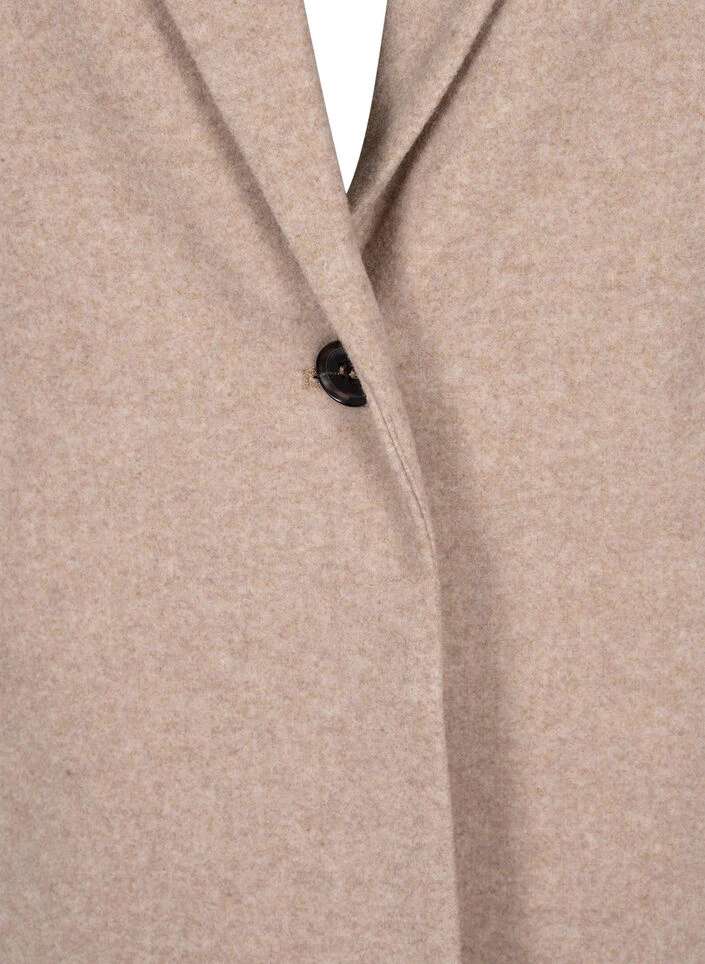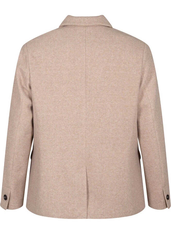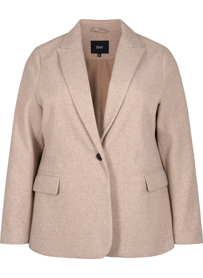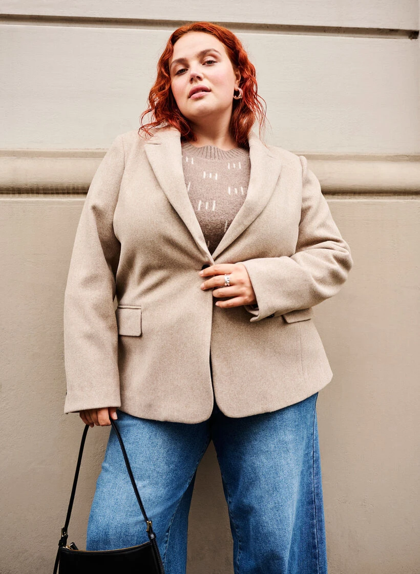 Melange blazer with front button fastening, wide lapel, decorative pocket details and back slit. The blazer is made from a heavy fabric, so it can be worn as a transitional jacket or indoors with a top underneath.