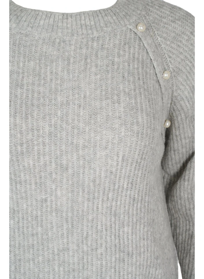 Beautiful mottled pullover in a soft mix of materials with wool. The knitted blouse has a round neckline and is decorated with feminine pearl buttons at the shoulder.