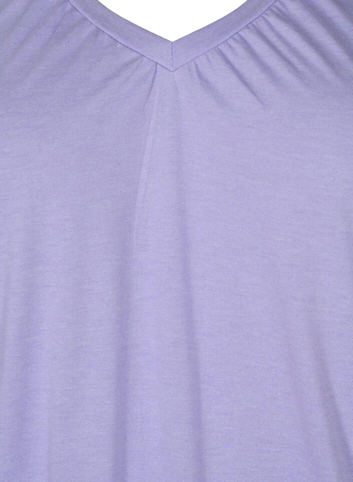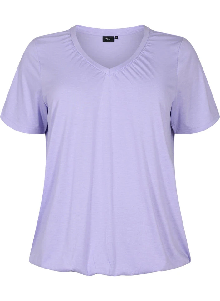 Melange t-shirt with short sleeves and v-neck. It has a loose fit with an elasticated bottom, which gives a nice balloon effect.
