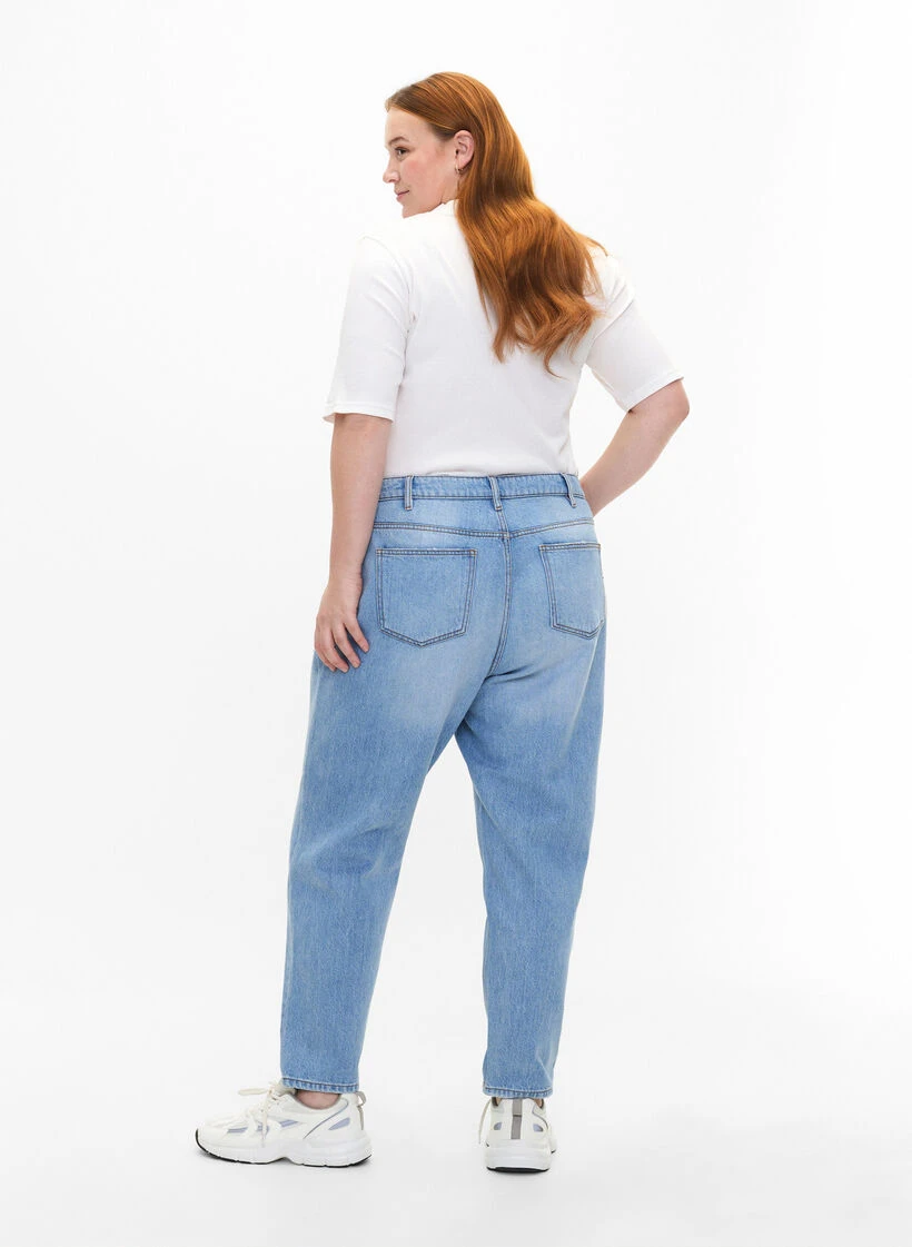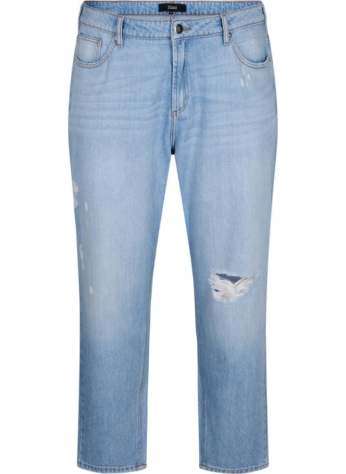 High-waist jeans in a soft cotton blend with 31% TENCELTM Lyocell, designed with ankle length, cool ripped details and classic pockets and belt loops. These jeans have an inside elastic waistband and a relaxed fit around the thighs and calves, narrowing at the ankle.