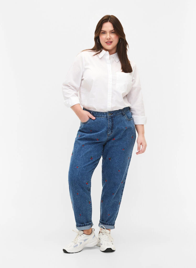 High-waisted mom fit jeans with delicate embroidered details. These jeans are designed with ankle-length and a loose fit on the thighs and calves, featuring classic belt loops, front and back pockets, and an adjustable elastic inside the waist.