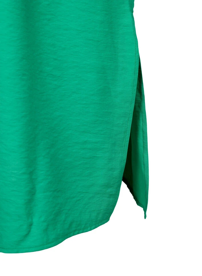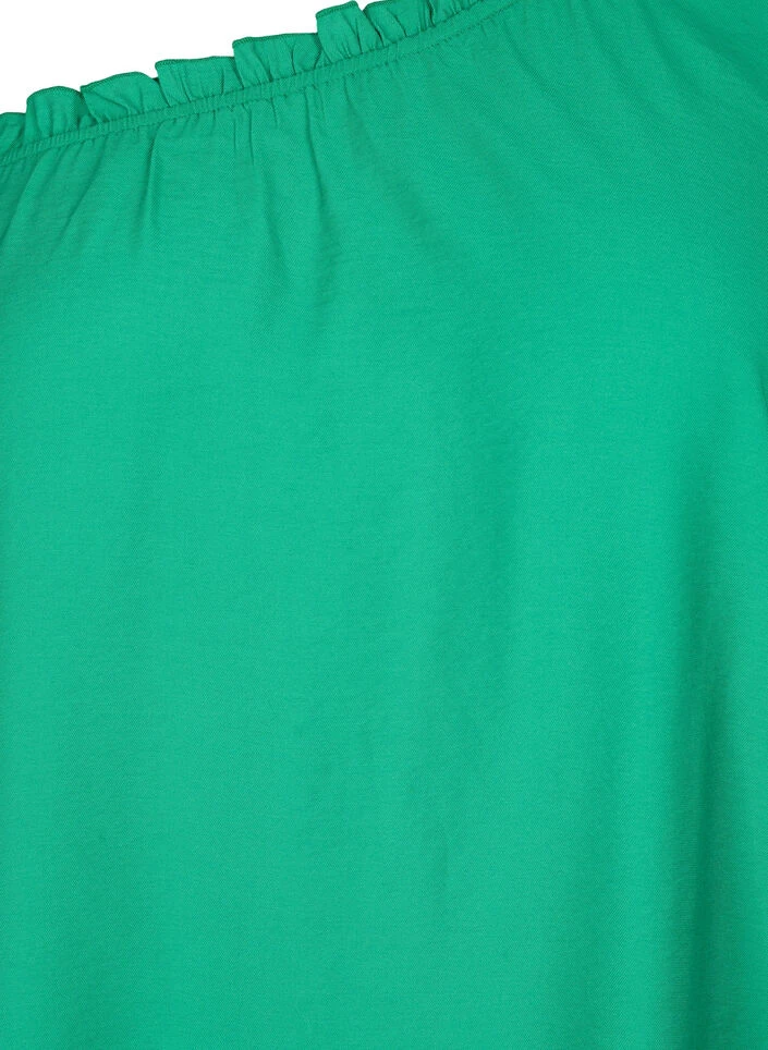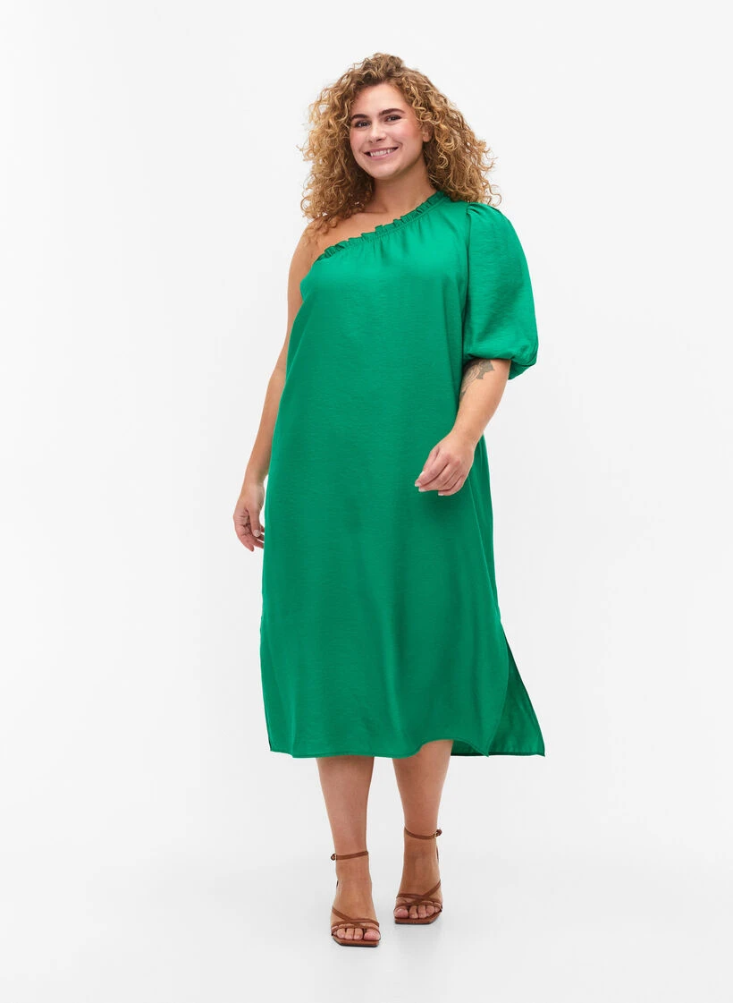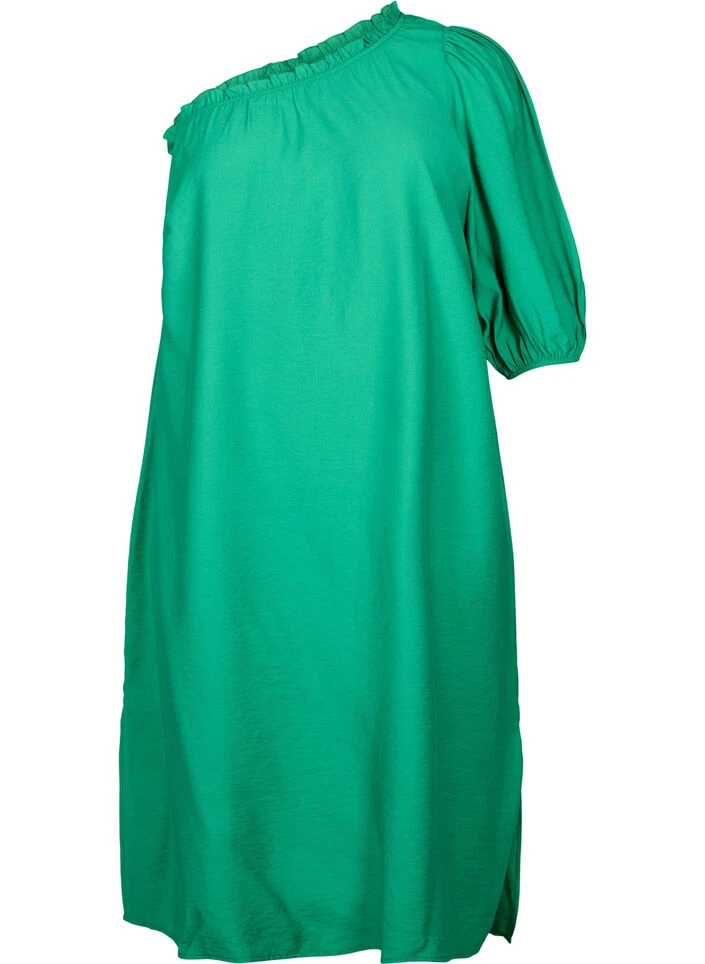 Loose-fitting one-shoulder dress in a lovely viscose quality with midi length. The dress has a ruffled edge at the neckline, a slit at the side and a short sleeve with gathering at the shoulder, which gives a slightly puffed sleeve.