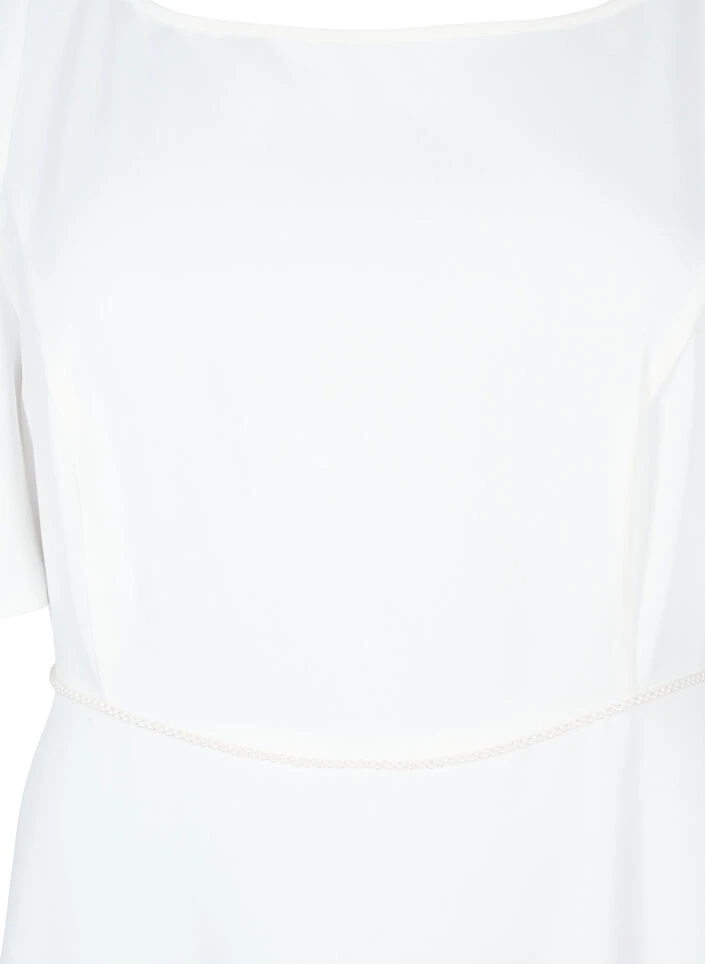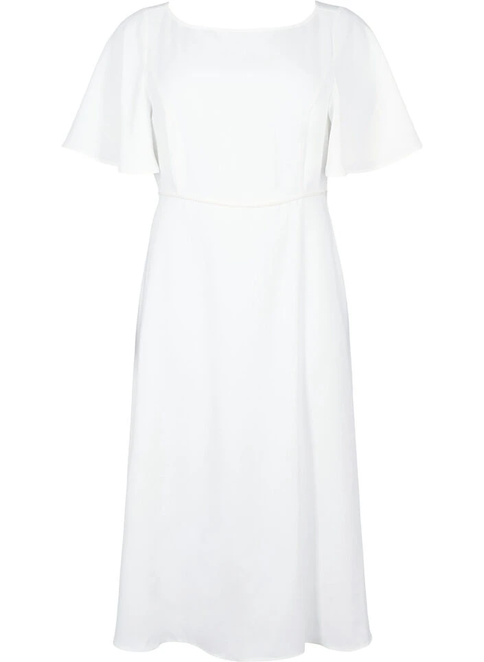 Elegant midi length dress with a boat neckline at the front and a v-cut at the back. The dress is designed with loose batwing sleeves, a hidden side zipper, and a beautiful empire cut with a cutline waist and small beads to create a feminine silhouette.