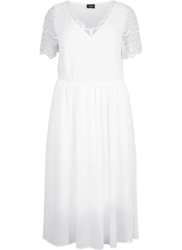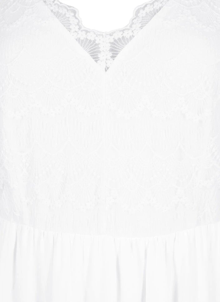 An elegant dress with an empire waist and a soft viscose lining that gives a nice drape to the loose A-line silhouette. The dress is designed with a beautiful lace top with short sleeves and a V-neckline and has a hidden side zipper