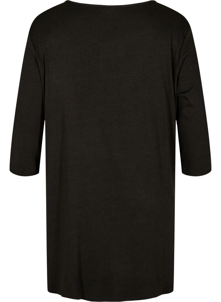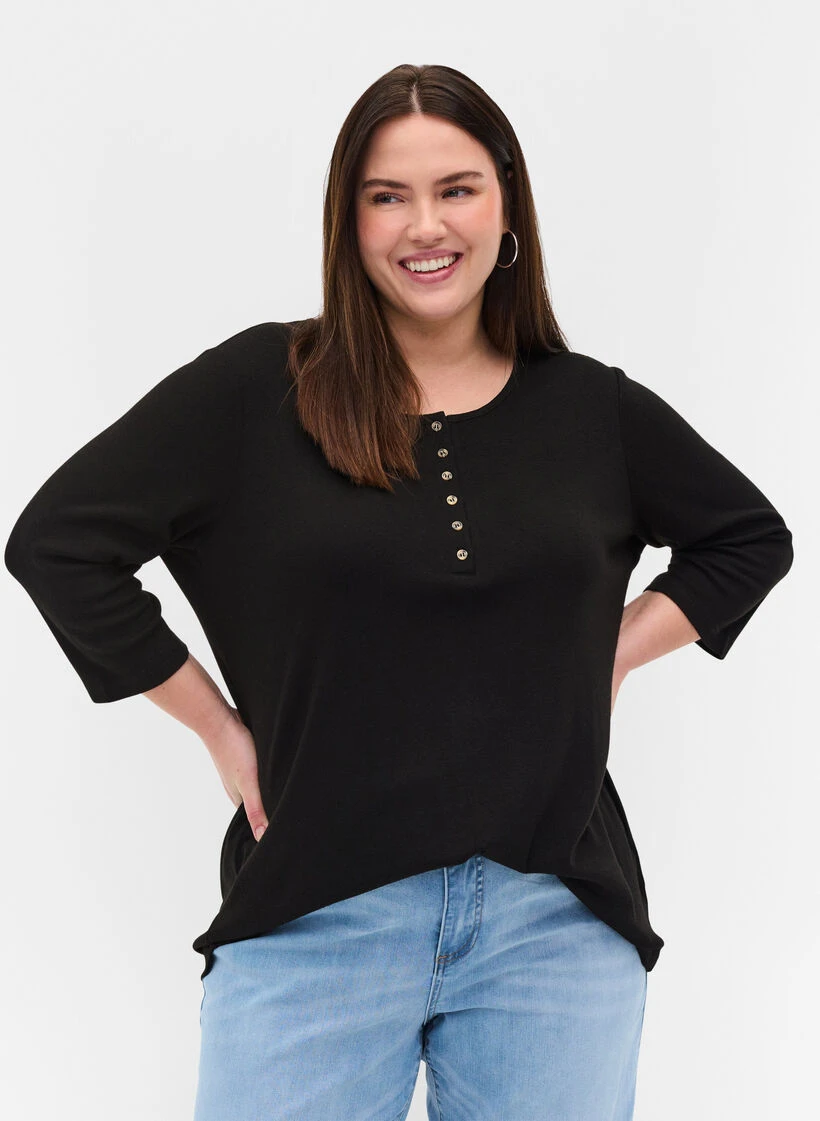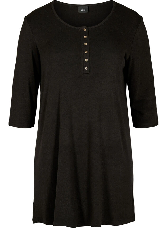 Simple blouse with crew neck and buttons at the front. The blouse has 3/4 sleeves, a loose fit, and is very comfortable to wear.