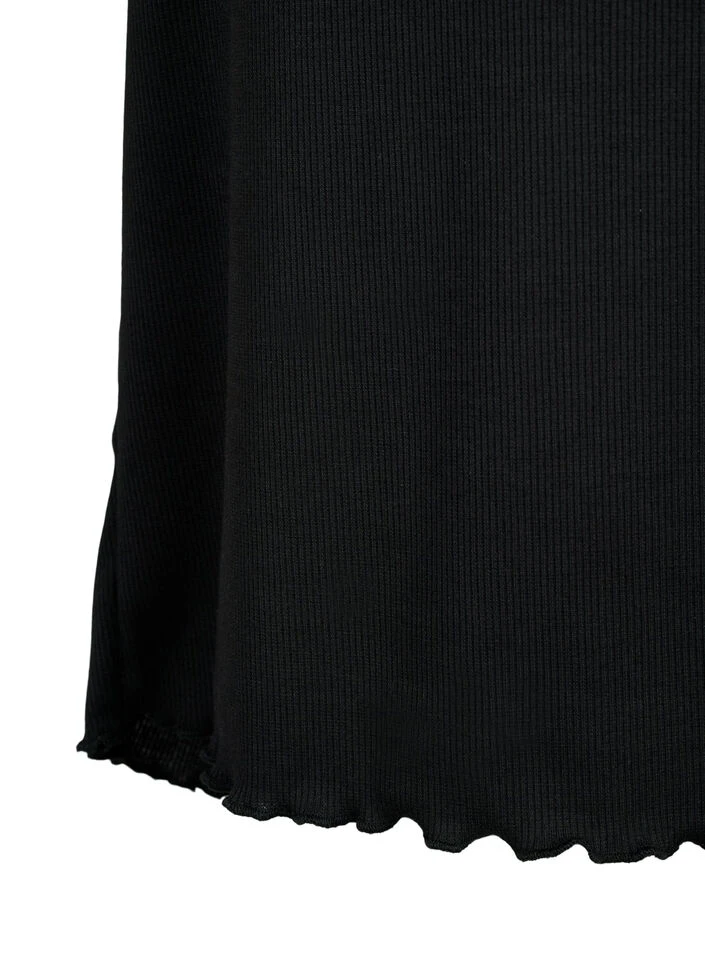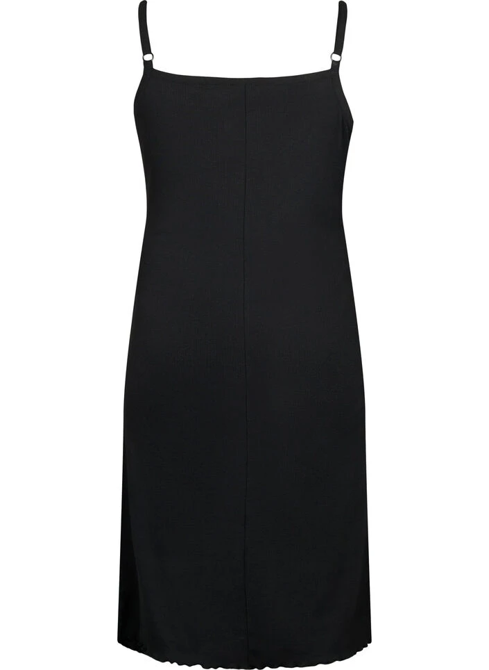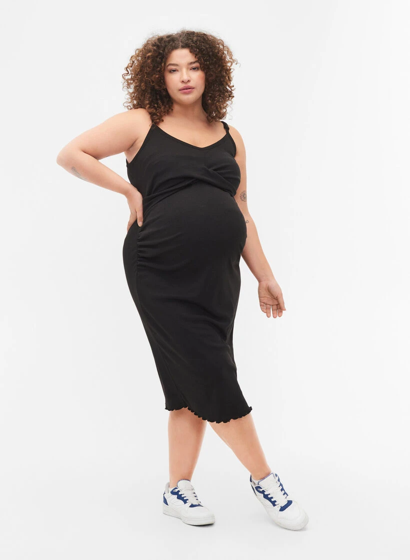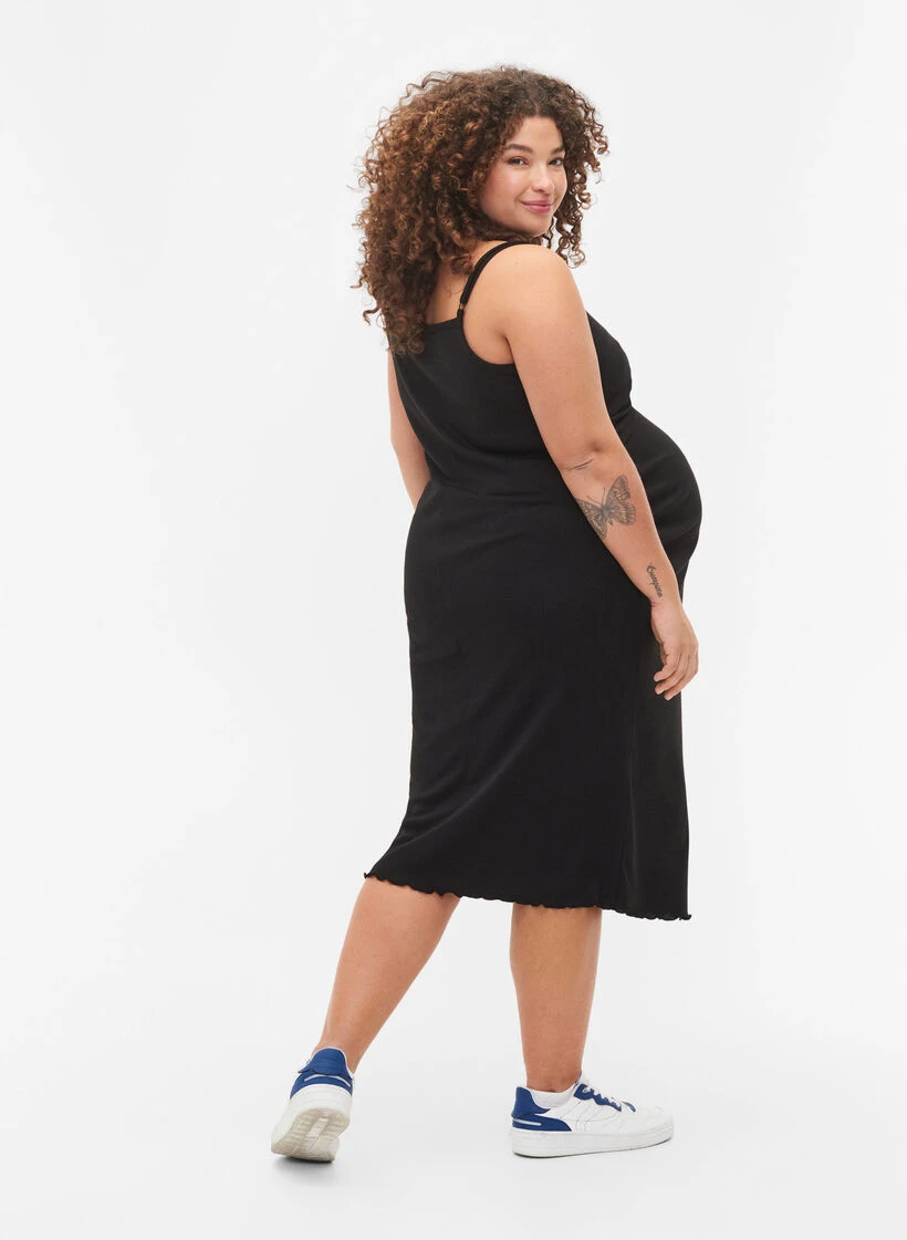 Solid colour maternity dress in a stretchable rib fabric. It has thin adjustable straps, tucks in under the breast and room for the growing belly.