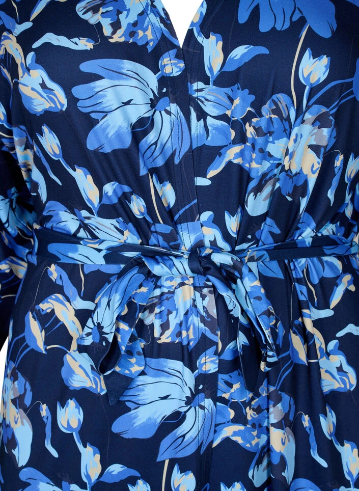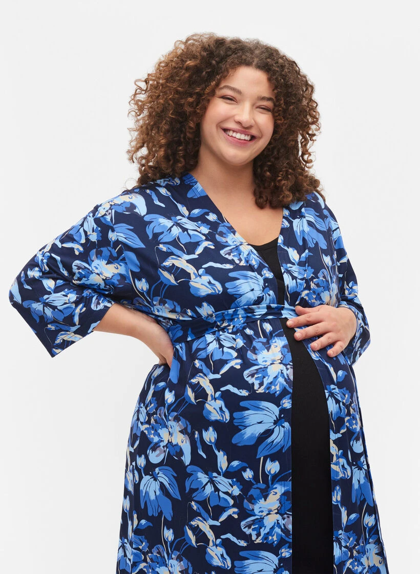 Floral kimono in a soft and stretchy fabric with 3/4 sleeves. It has a loose tie at the waist, so you can easily emphasise your growing belly.