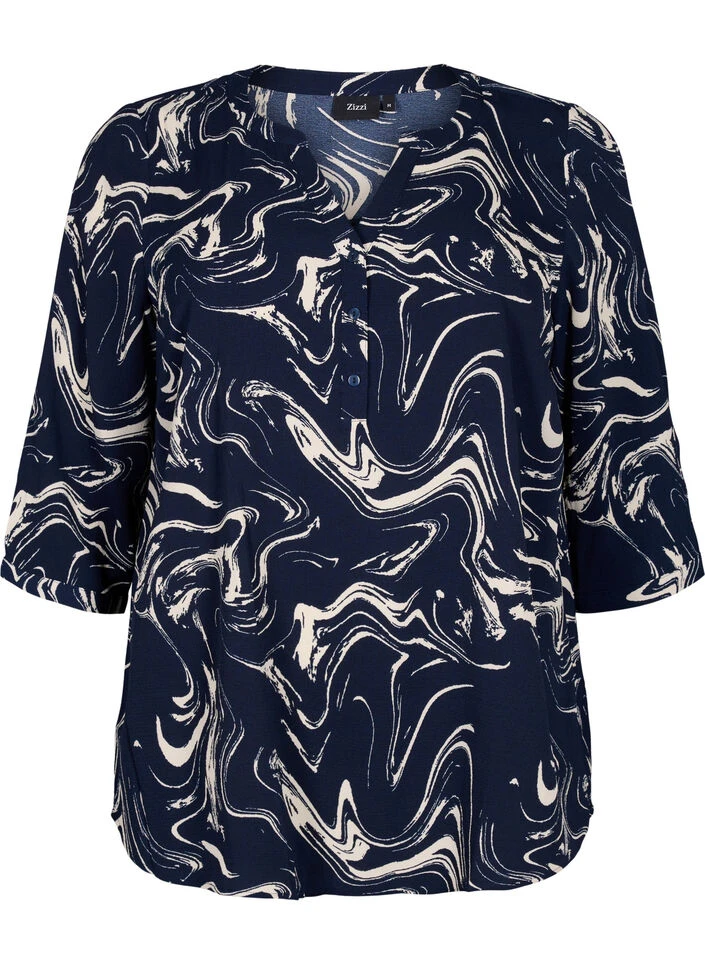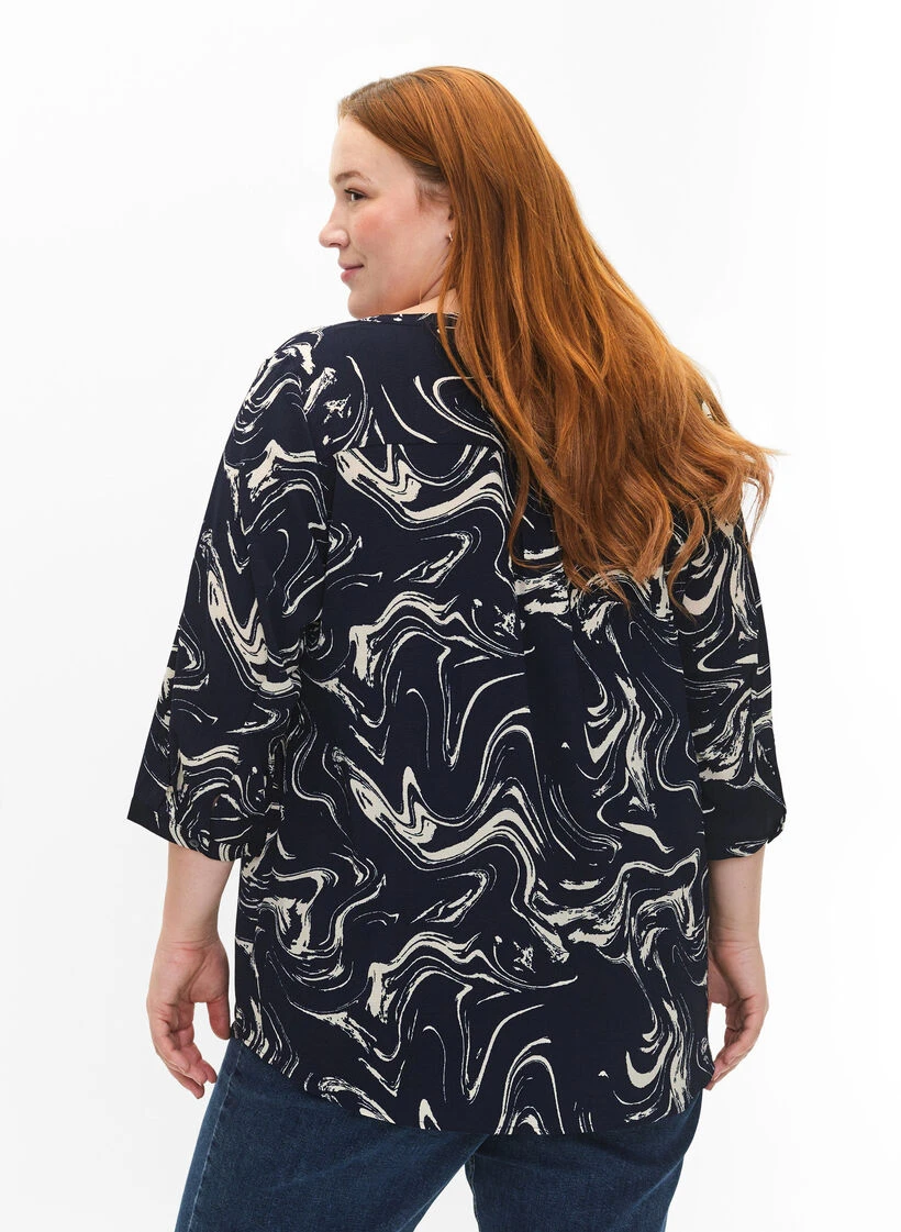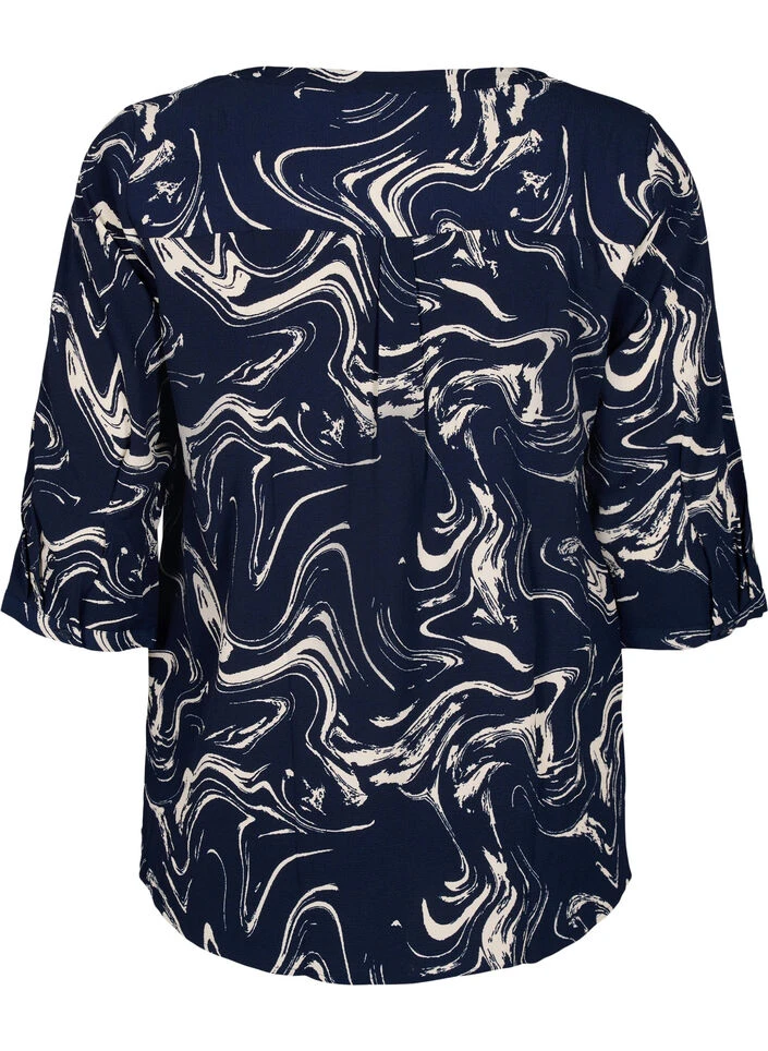 Blouse made with 55% recycled polyester and a nice all-over print. The blouse has 3/4 sleeves and a small V-neck with button closure at the front.