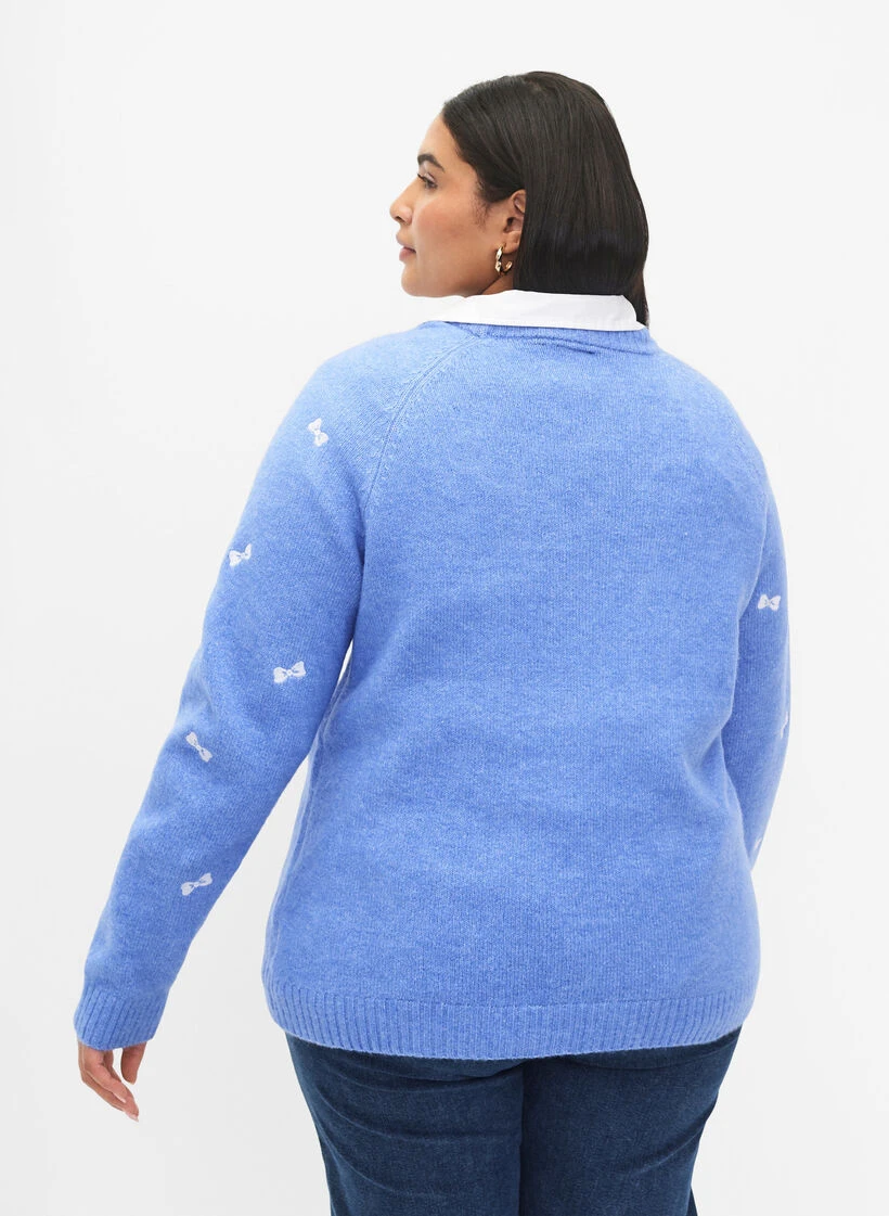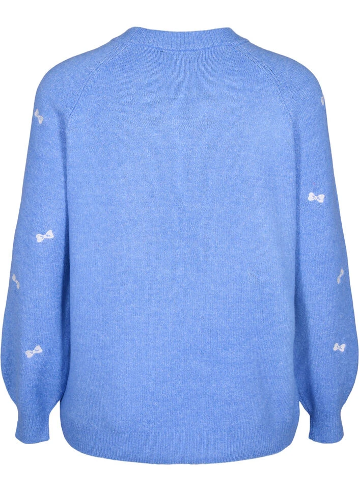 Soft and comfortable knitted pullover with delicate embroidered bows. The pullover has ribbed cuffs on the sleeves, ribbed neckline and hem and a regular fit.