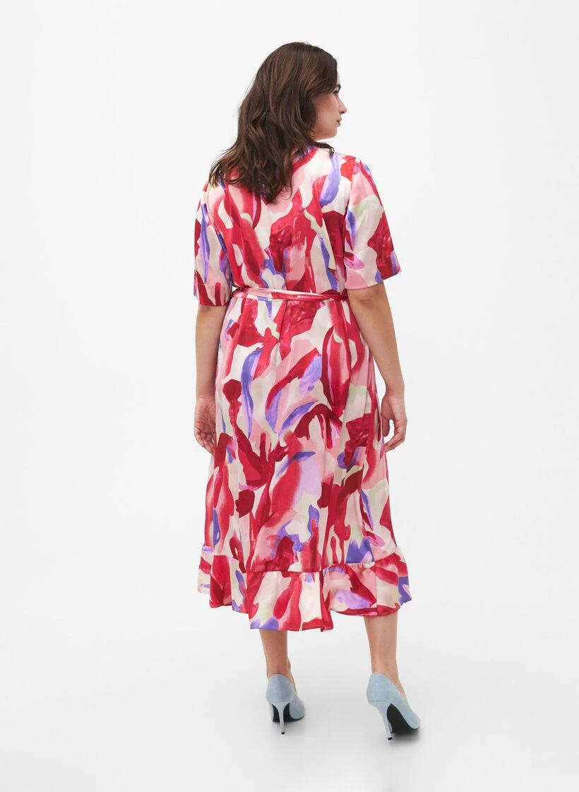 Elegant satin dress in 100% recycled polyester with a beautiful all-over print. The dress has short sleeves, a v-cut, and a drawstring at the waist for a beautiful wrap design and the feminine look is completed with beautiful ruffle details.