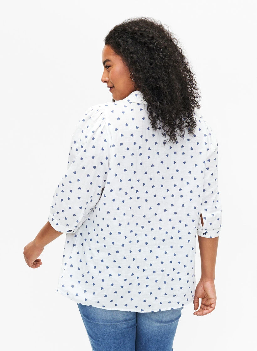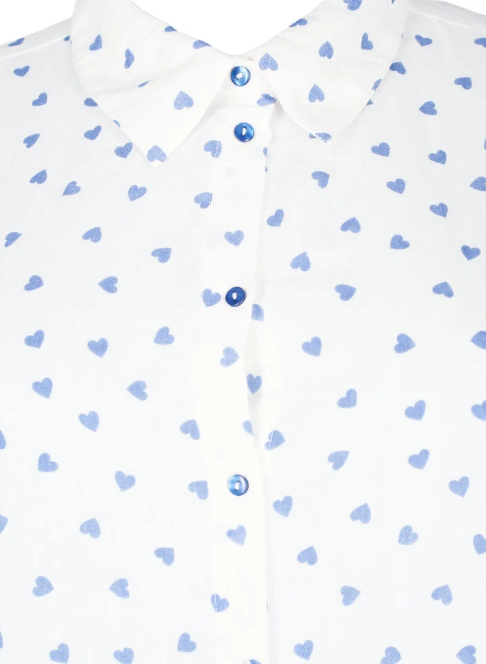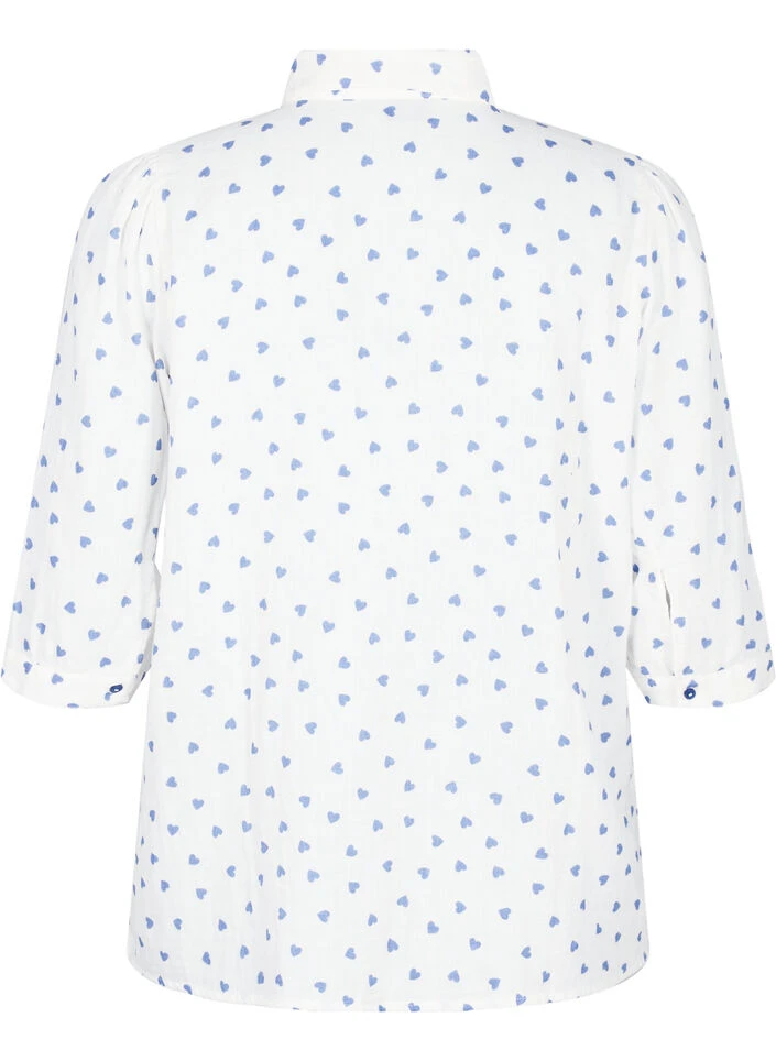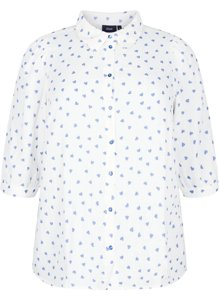 Feminine shirt blouse in 100% cotton with a beautiful all-over heart print. The shirt has a regular collar and 3/4 sleeves with a puff effect.