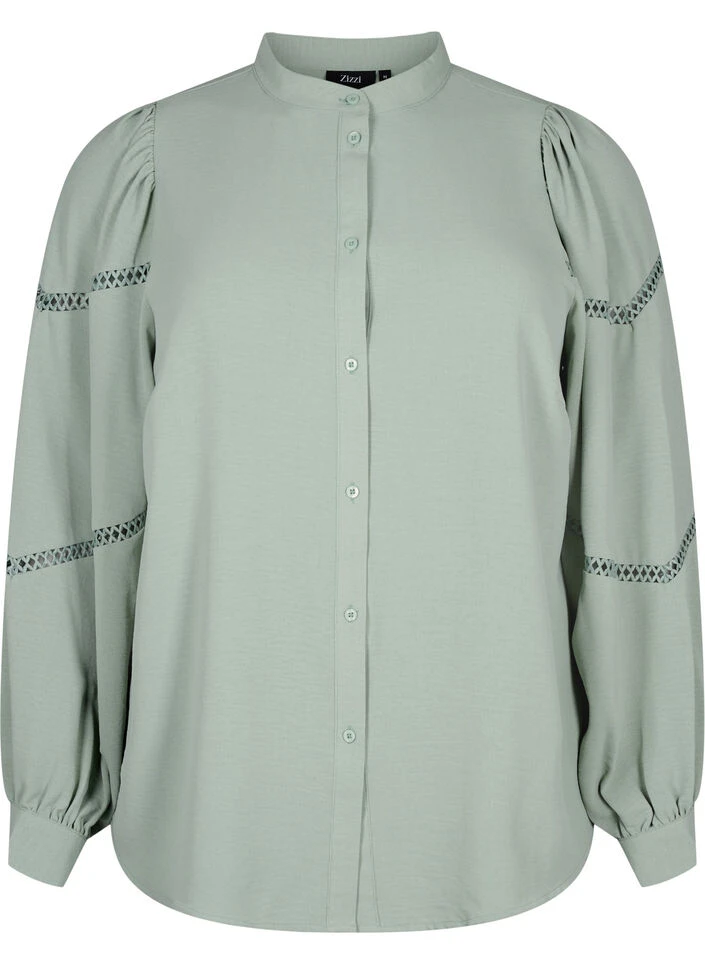 Shirt blouse with decorative crochet details on the sleeves, and pleats on the shoulders that create a slight puff effect. The shirt is made from 51% recycled polyester and has a regular fit.