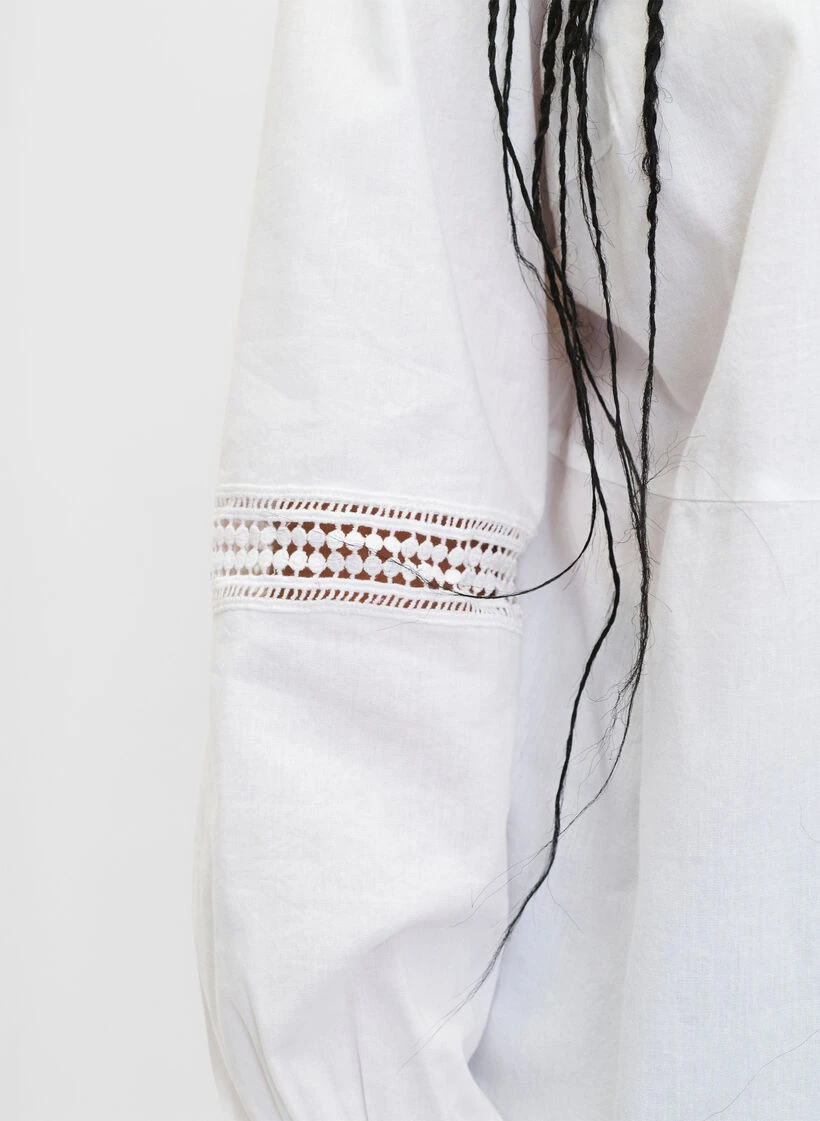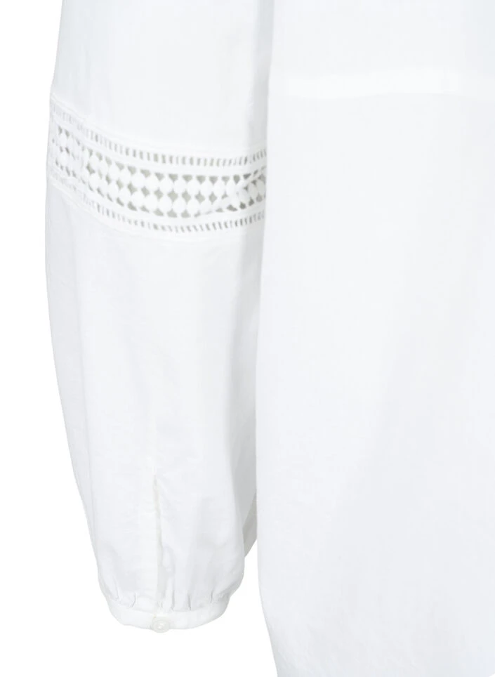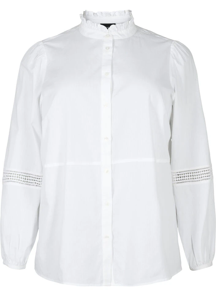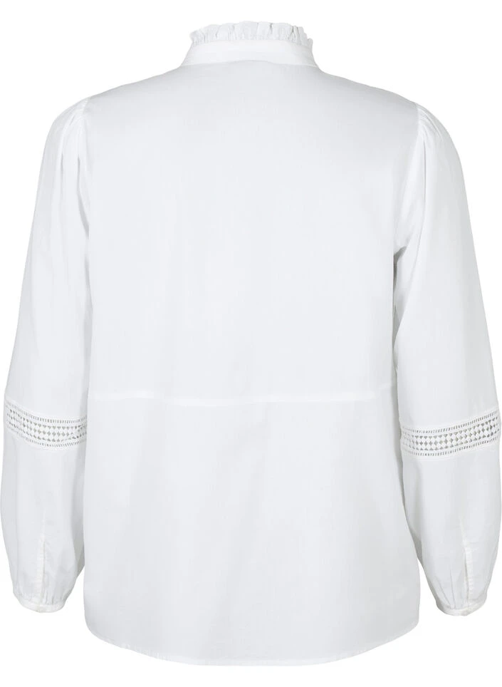 Feminine shirt blouse in a comfortable cotton blend with viscose. The shirt blouse is designed with a fine ruffle collar, and a beautiful crochet ribbon on the sleeve.