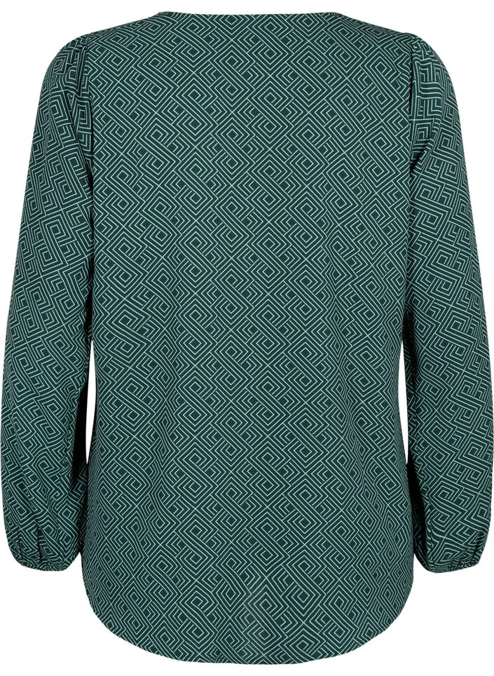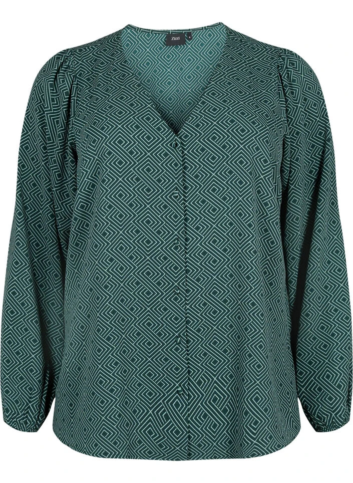 V-neck shirt blouse with long sleeves and elasticated hem. The shirt blouse closes with buttons and is made from a nice material with 55% recycled polyester and a beautiful all-over print.