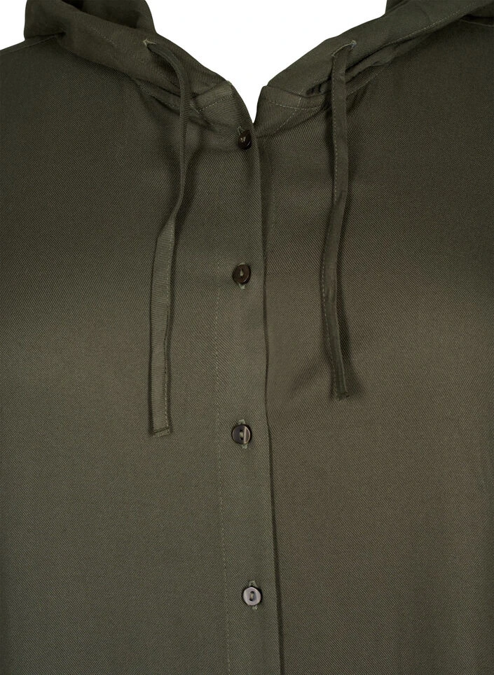Shirt dress in 100% viscose with a hood and adjustable drawstrings. The shirt dress has rolled-up sleeves and a cutline on the back, which gives the dress a nice drape.