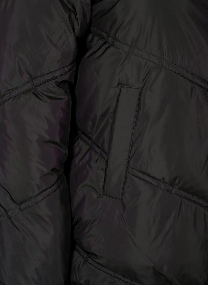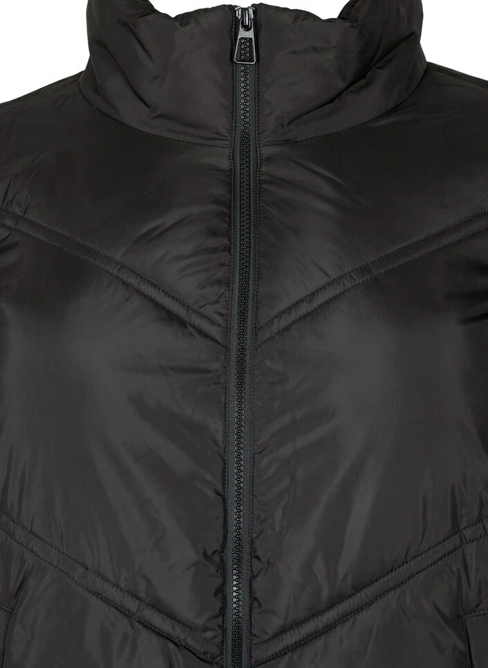 Short puffer Winter jacket with decorative diagonal double stitching in a nice, shiny recycled polyester fabric. The jacket has a high collar, a chunky zipper, side pockets and elastic cuff sleeves.