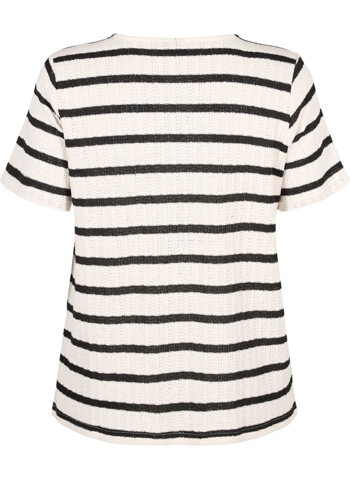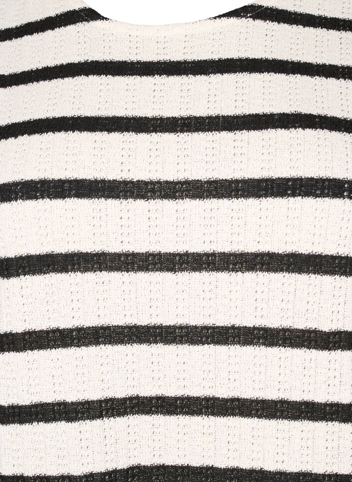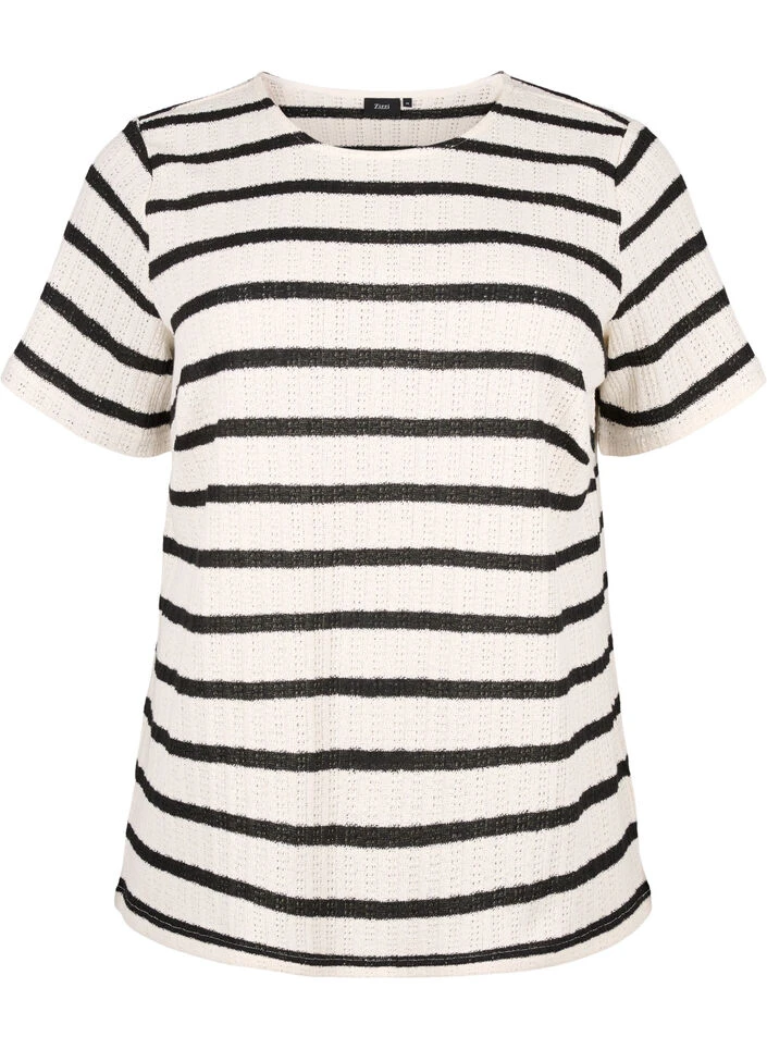 Short-sleeved blouse with a round neck and a comfortable fit. This blouse is designed with a beautiful knitted pattern and contrast stripes.