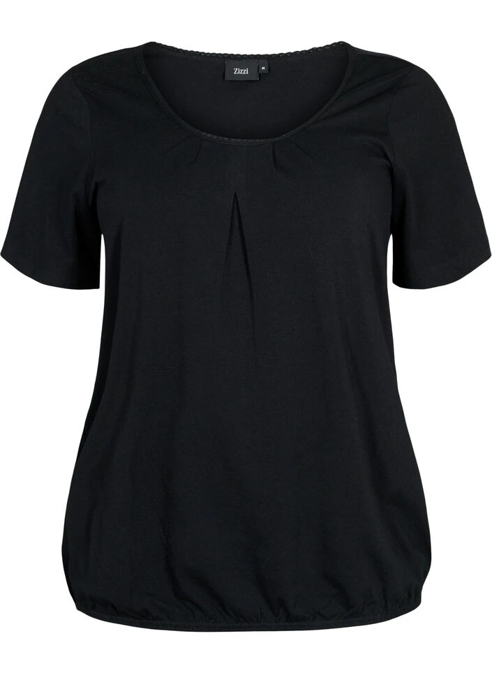 Loose and comfortable t-shirt with short sleeves, which is made in a soft cotton fabric. The t-shirt has a round neckline with lace trim, small drapes and elastic at the bottom.