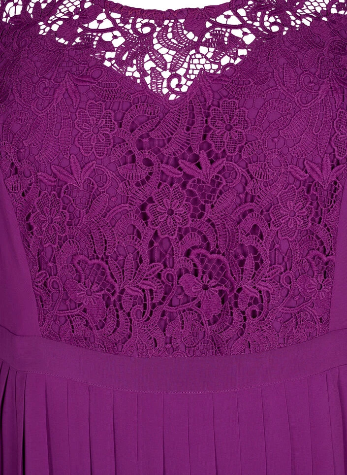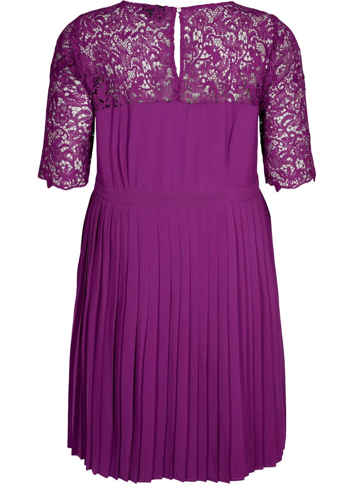 Beautiful pleated dress with a feminine lace top. The dress has a round neckline with button closure at the neck and short sleeves. It has a body-hugging bodice with a cut at the waist, after which it gets extra width at the bottom, which creates a beautiful silhouette.