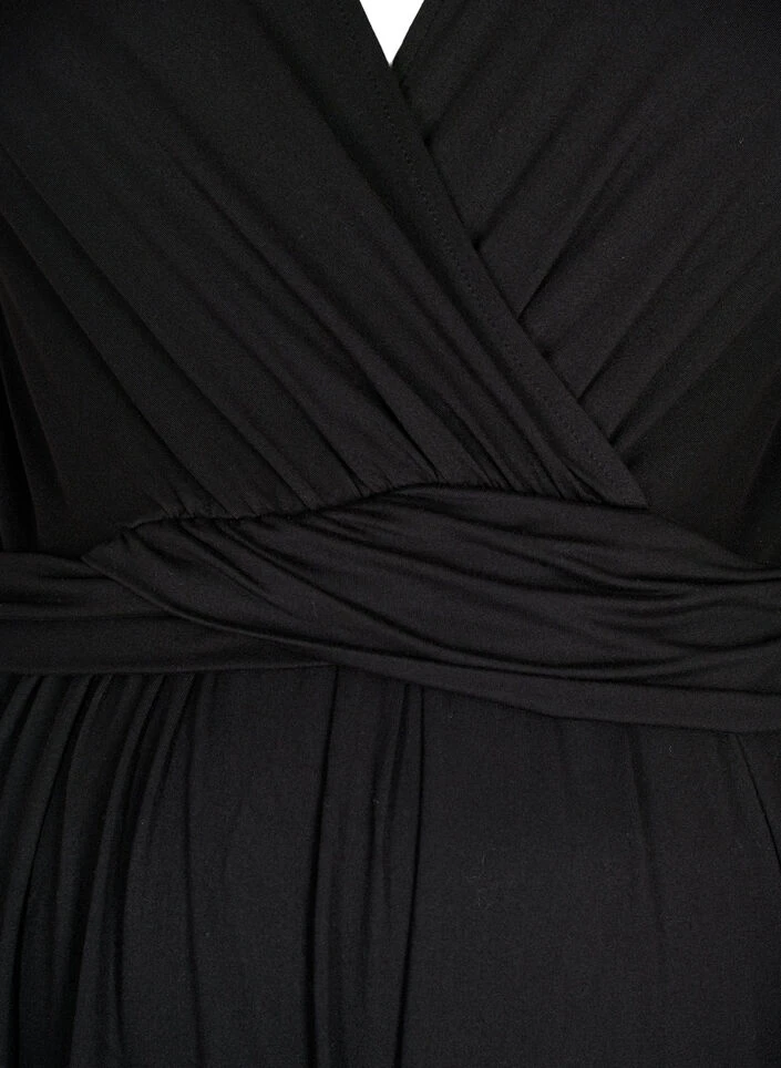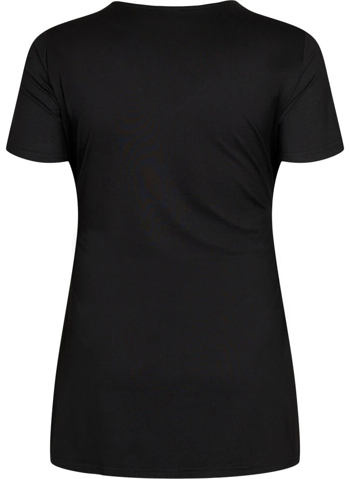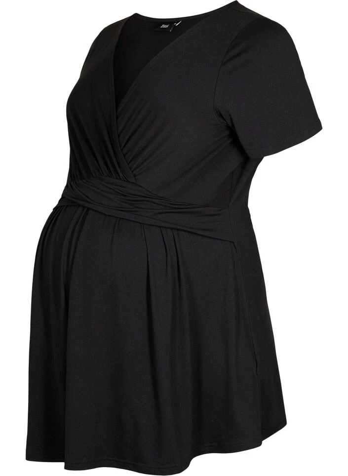 Short-sleeved maternity blouse, which is made in a comfortable and stretchable fabric. The blouse has a v-neckline with wrap look, which makes it useful as a nursing blouse after giving birth.