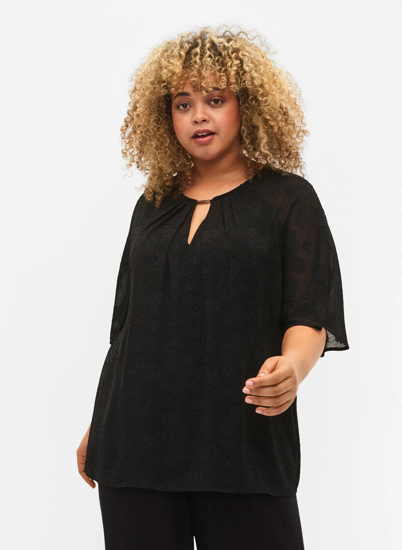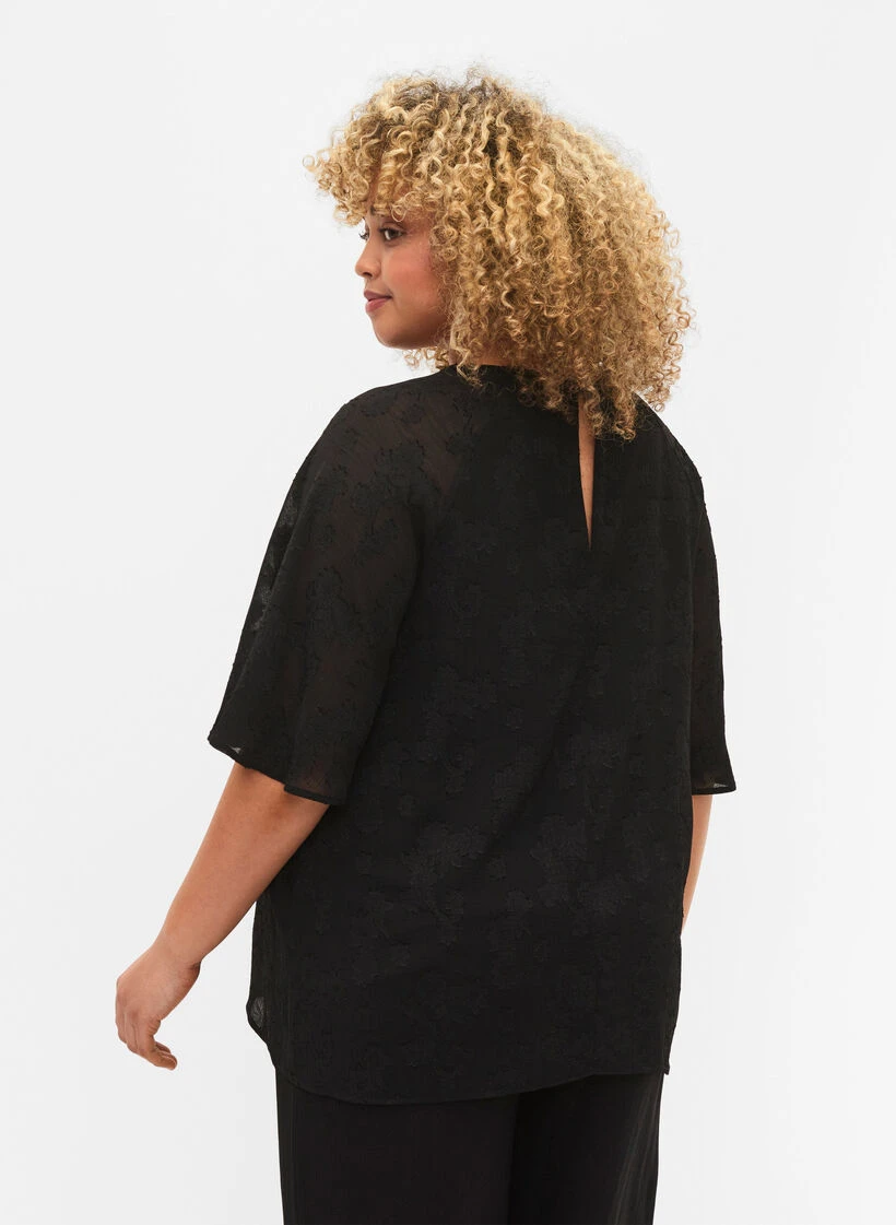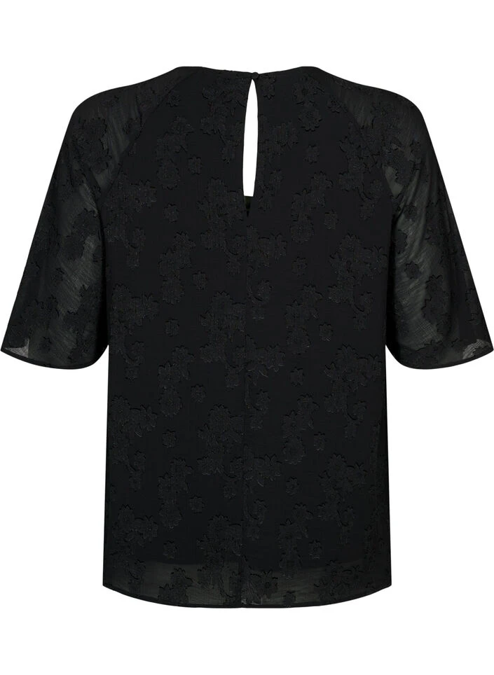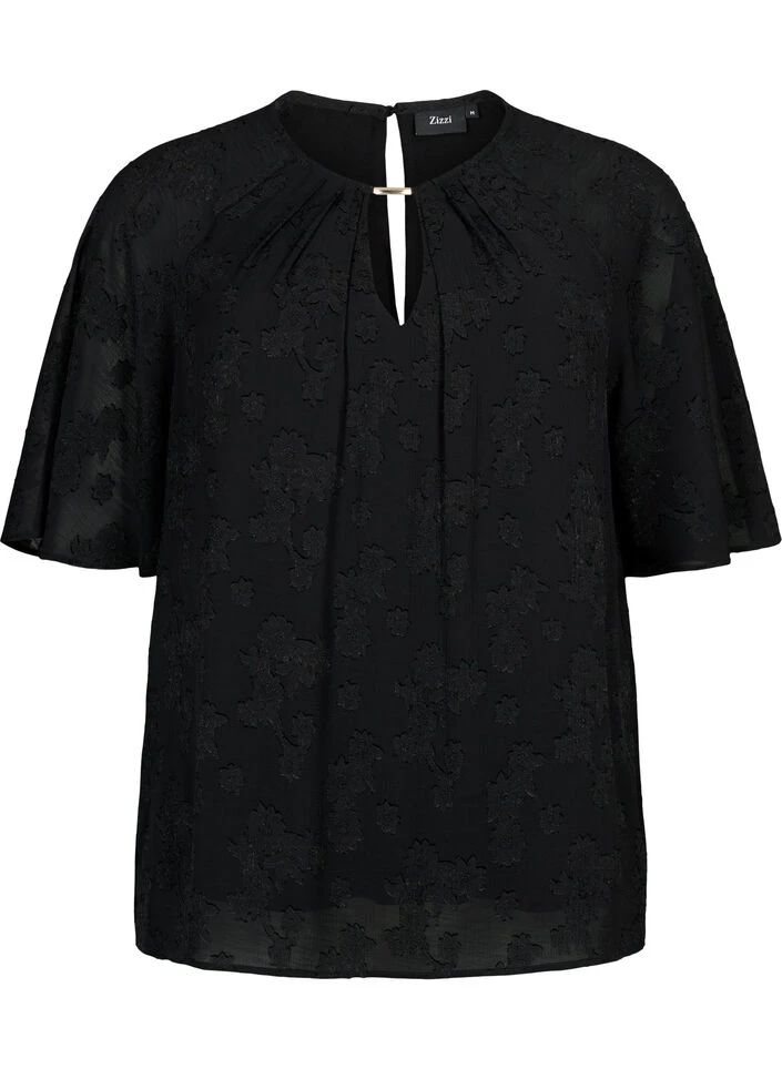 Feminine short-sleeved blouse with fine structure in the fabric. The blouse has a keyhole closure at the neck, a round neckline at the front with a fine v detail and drapes that give a beautiful fall.