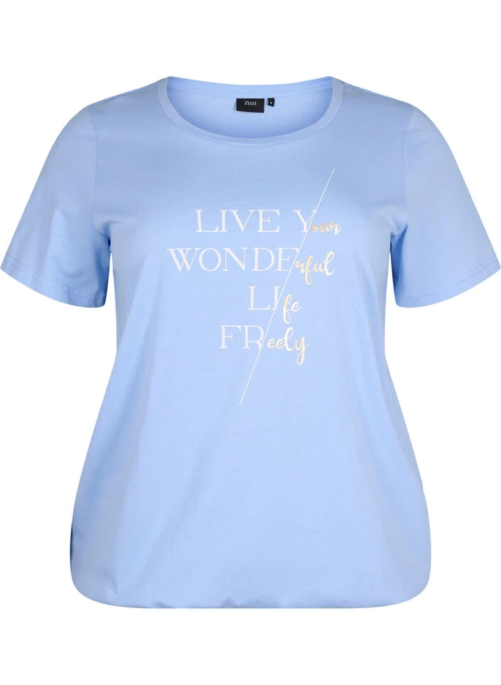 Short-sleeved t-shirt with print on the front, which is made in a soft cotton with 50% organic cotton. The t-shirt has a round neckline and is finished with elastic at the bottom, which gives a slight balloon effect to the loose fit.
