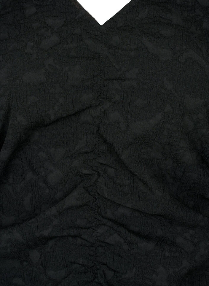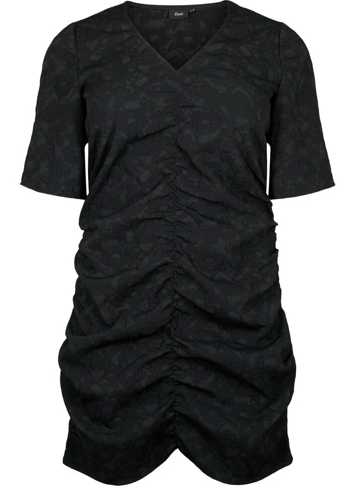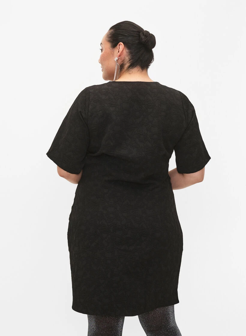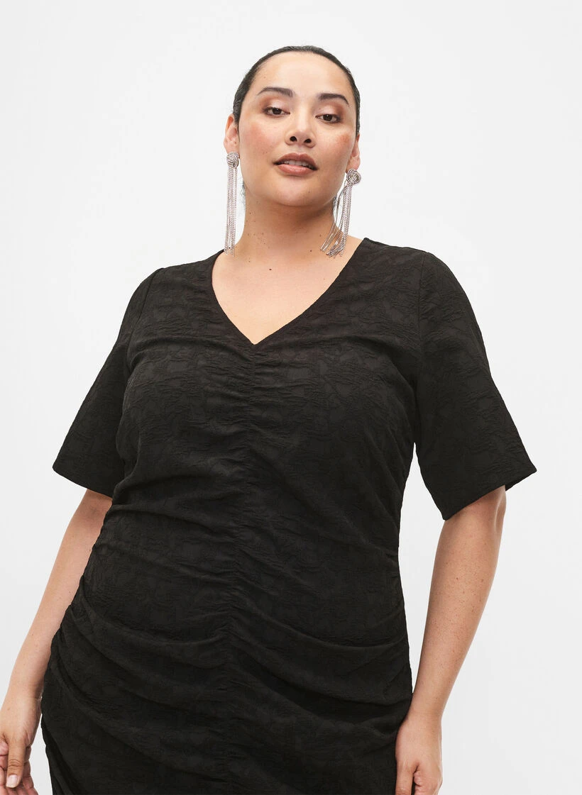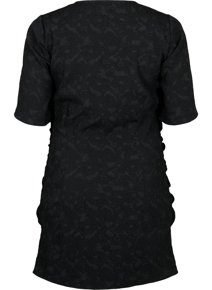 Beautiful dress with great texture and vertical drapes, for a flattering fit. The dress has a v-neckline, short sleeves and a hidden side zipper, making it easier to put on and take off.