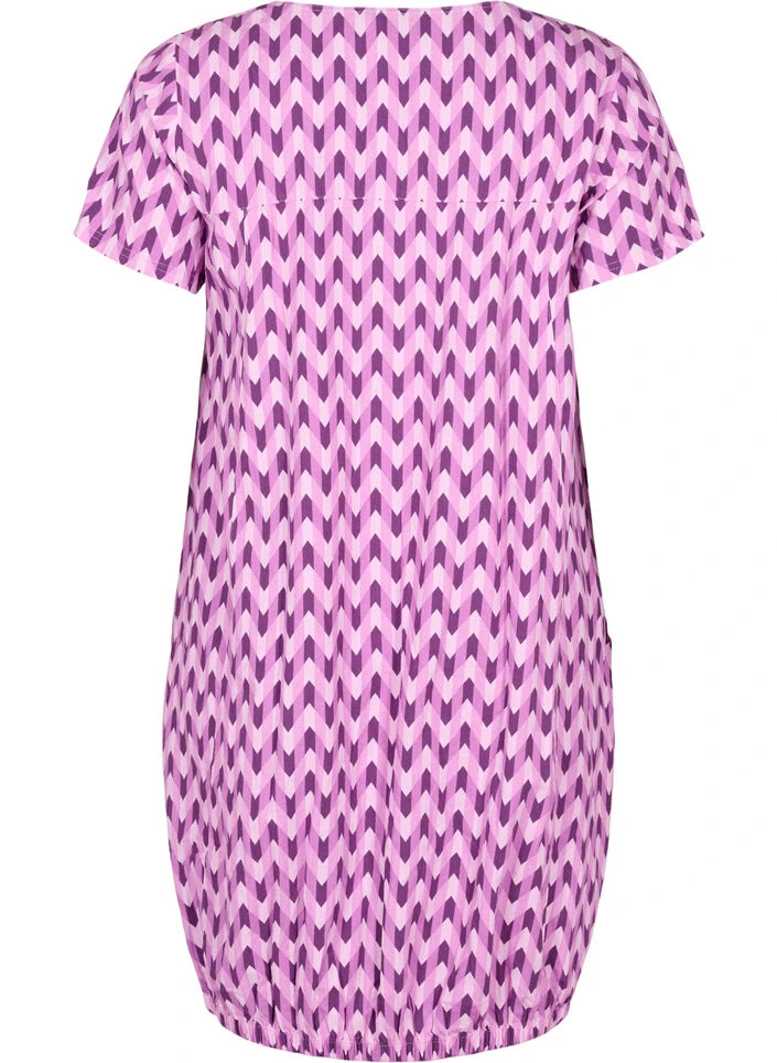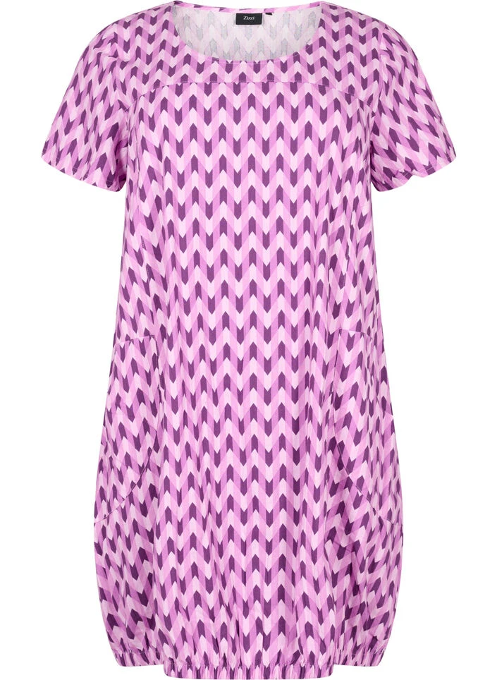 Feminine dress made from 100% cotton, with a gorgeous all over print. The dress has short sleeves, a round neckline, and front pockets. It is finished with an elasticated hem, which creates a lovely fit.