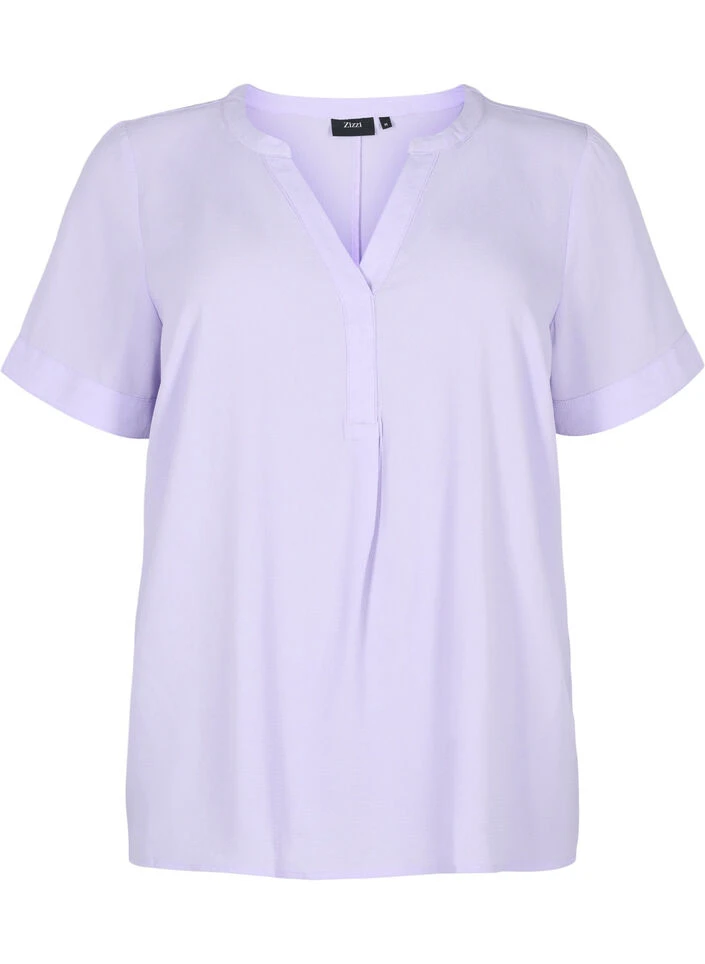 Solid-coloured blouse with a v-neckline and turned-up short sleeves. The blouse has a loose fit and is made from a fabric with 55% recycled polyester.