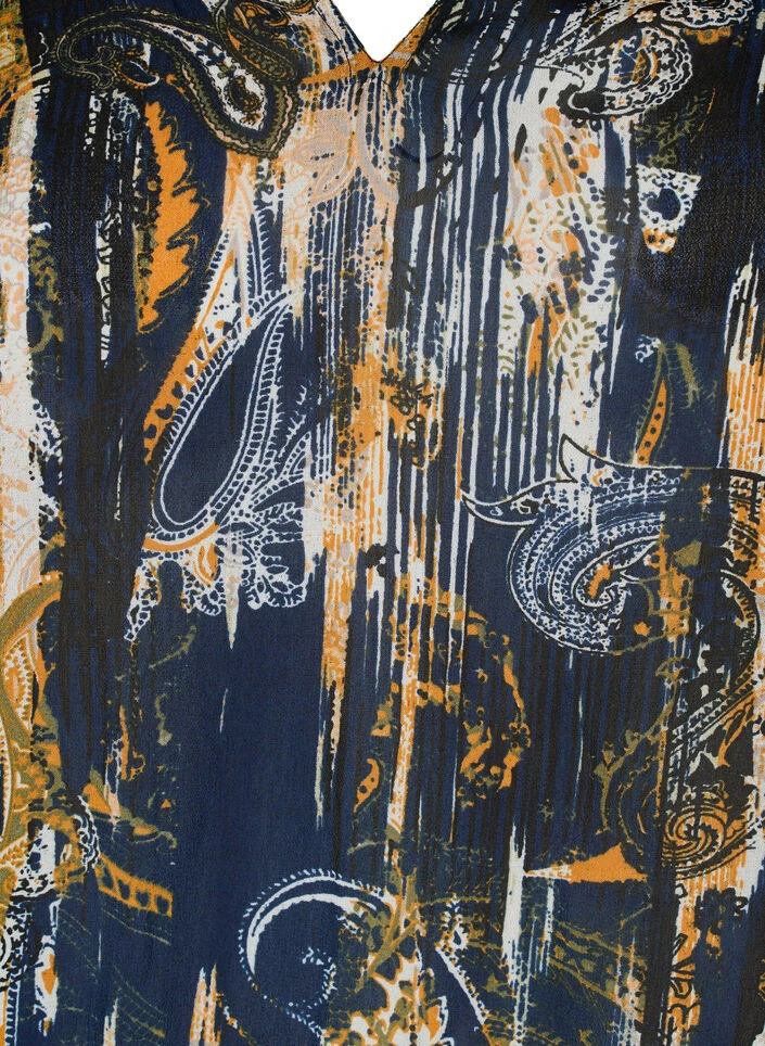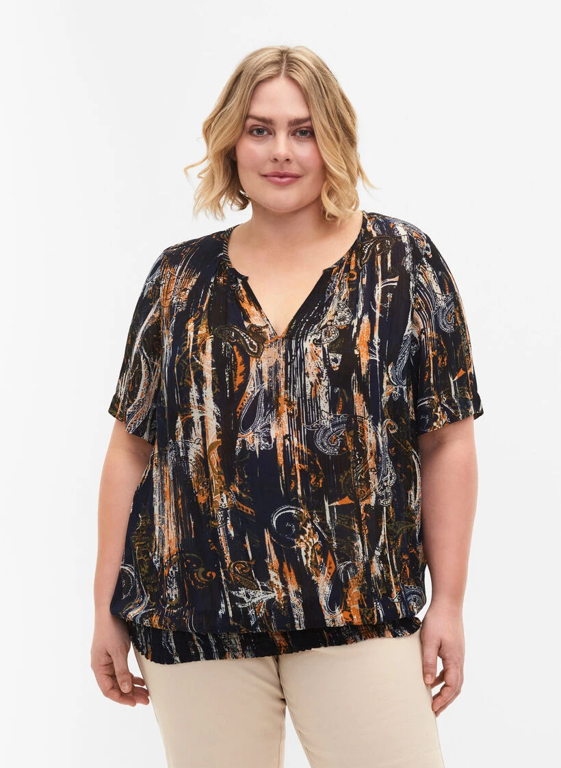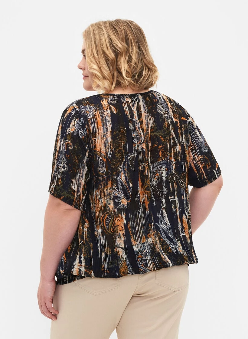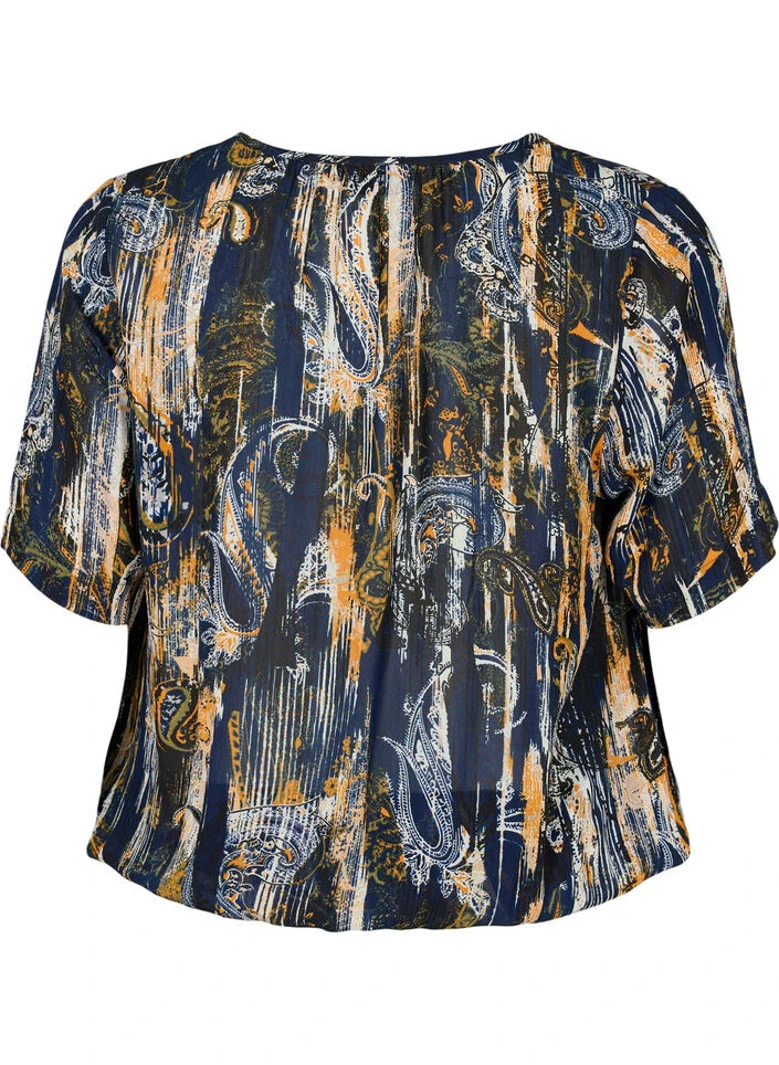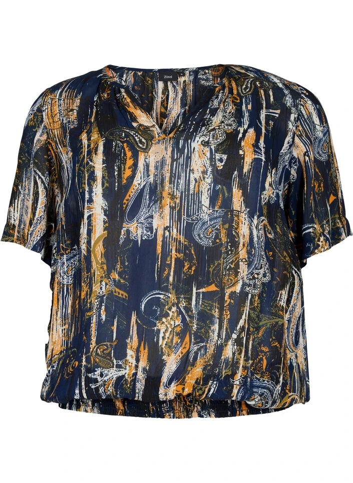 Nice blouse in a light viscose fabric with all-over paisley print. The blouse has a v-neckline, short sleeves and a smock edge at the bottom, which creates a nice balloon effect.