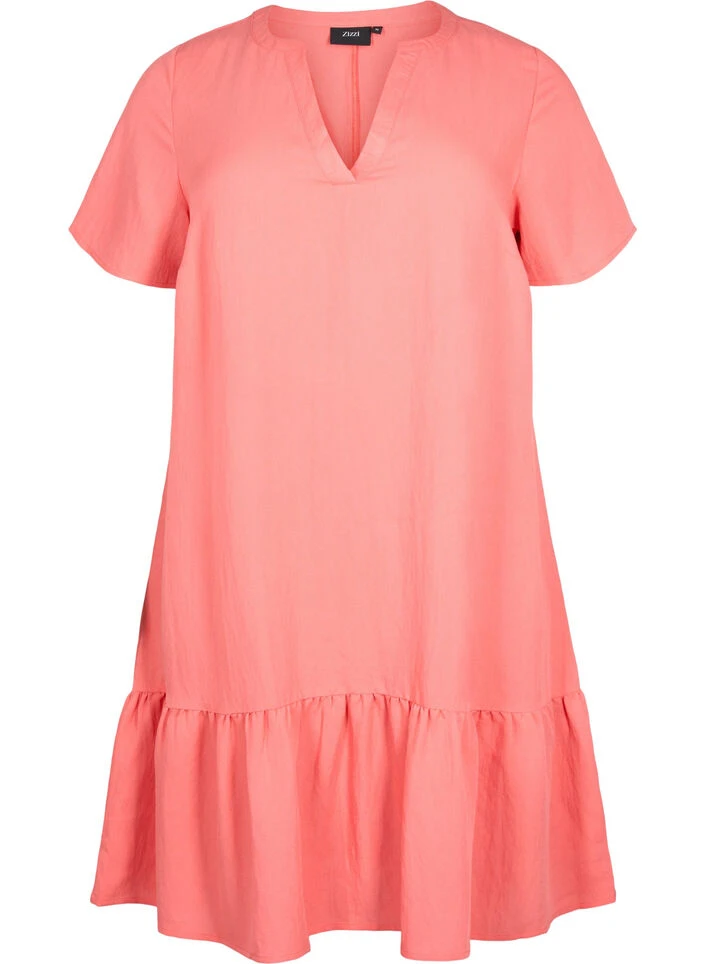 Short-sleeved dress in a soft viscose fabric with loose a-shape, which falls easily on the body. The dress has a fine v-neckline and ruffle finish at the bottom, which gives a super feminine look.