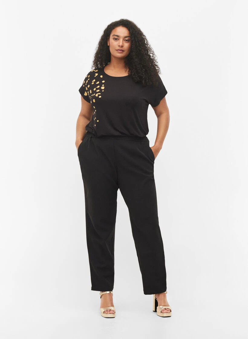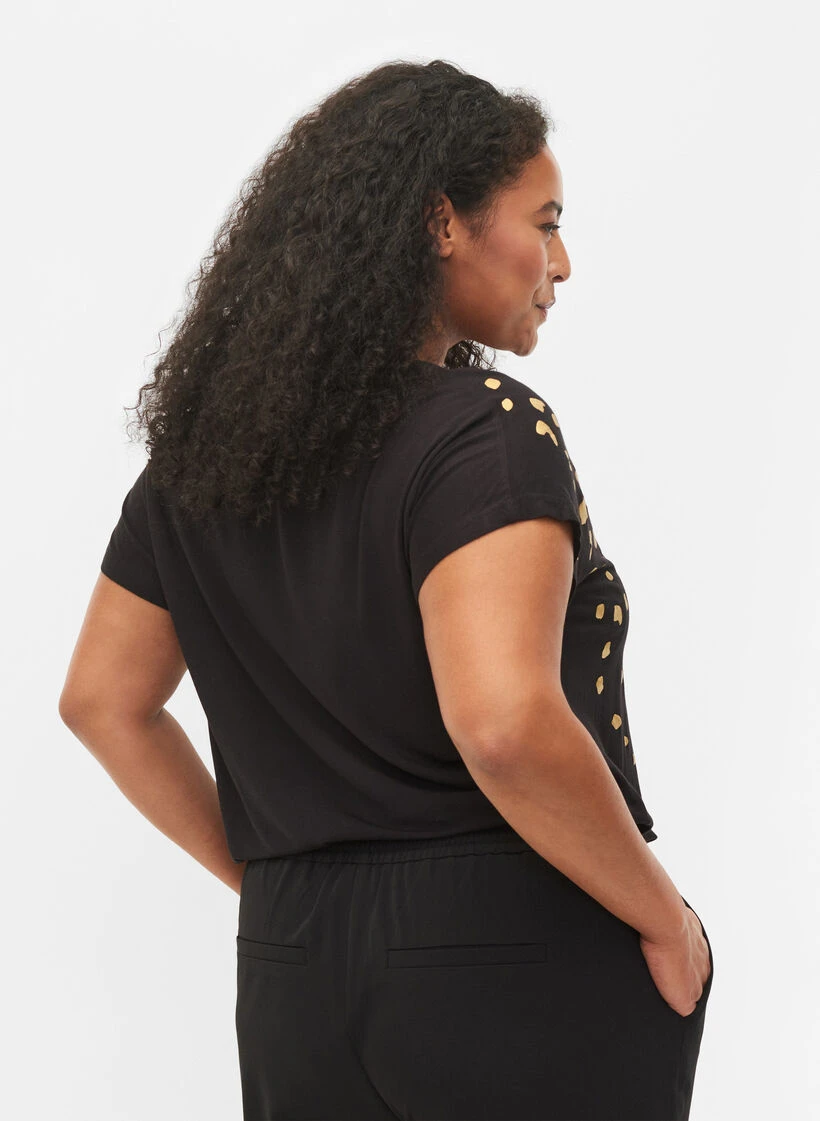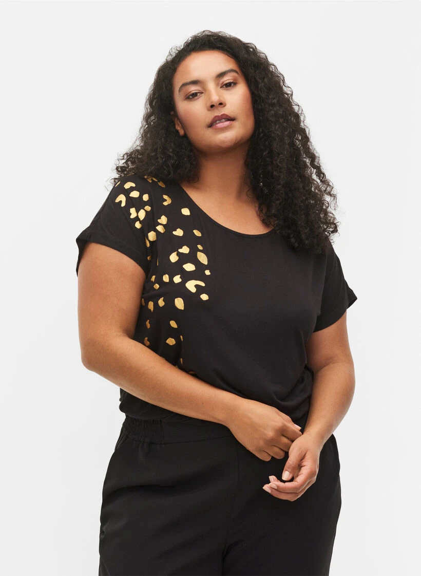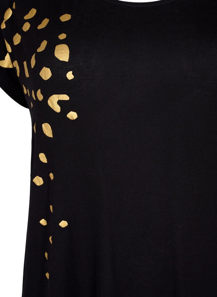 Short sleeve t-shirt with a round neckline and gold print on the front. The t-shirt has a loose fit and is made out of soft viscose.