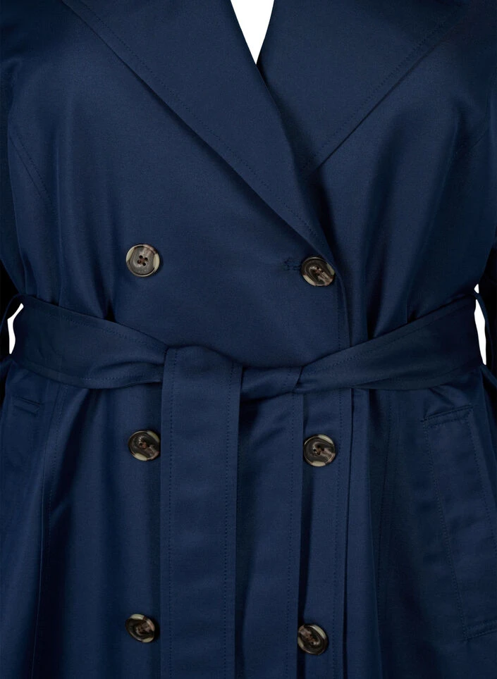Timeless trench coat with double-breasted buttons and side pockets. The trench coat has a classic design with a collar, lapel and a detachable belt to accentuate the feminine silhouette.